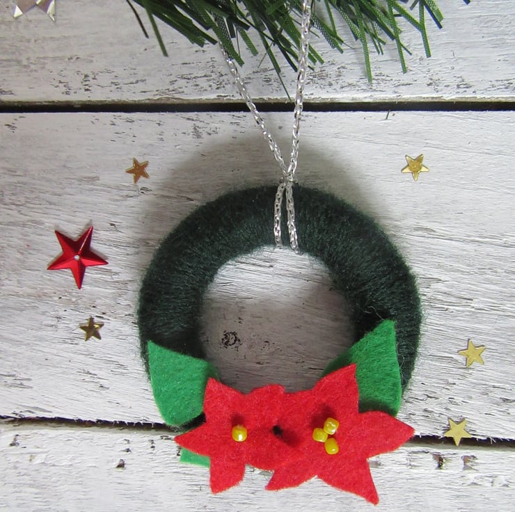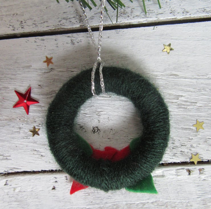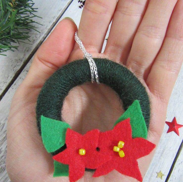 These mini wreaths have been upcycled from solid wood curtain rings, covered in dark green acrylic wool, with bright green felt leaves, red felt flowers and yellow bead centres. Each Christmas wreath can be hung using the silver thread.