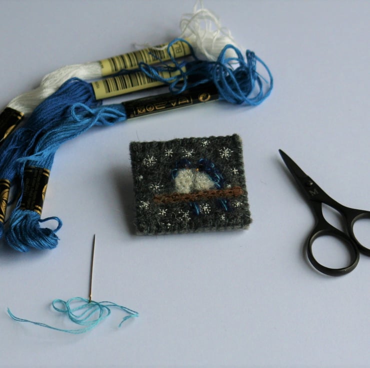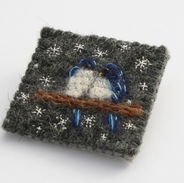 A One-Of-A-Kind hand embroidered square (ish) brooch of two blue birds snuggling together to keep warm while the snow falls around them. The birds have been made by needle felting the design onto wool felt in white and blue wool roving which has been embroidered over to detail the birds feathers. They are sitting on a branch that has been made the same way. I imagined the little birds fluffing their feathers up to stay warm and so I used the needle felting to give that sense of fluffiness. Each snowflake has been embroidered individually in different patterns and fall all around the birds perch. This cute snow scene has then been backed onto a thick piece of wool felt in my signature style which makes the finished brooch quite sturdy.