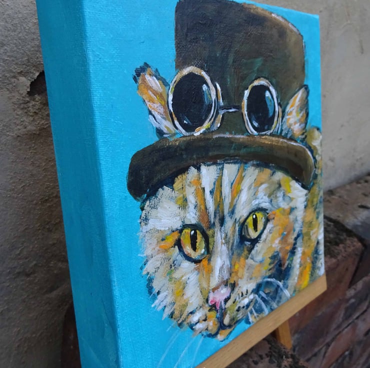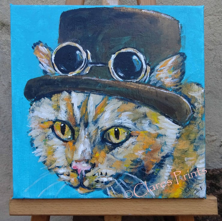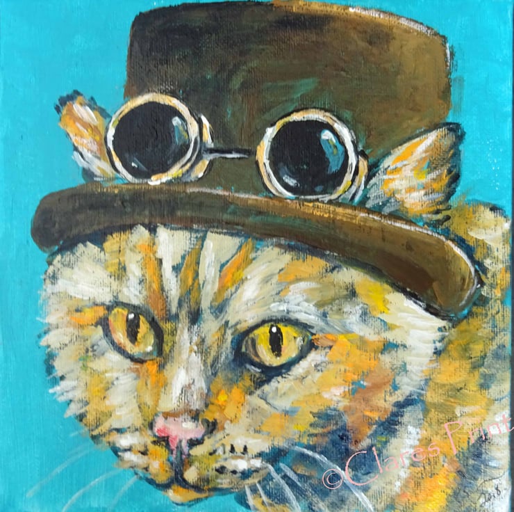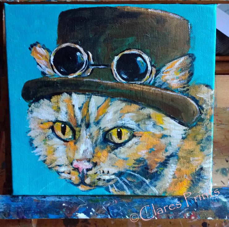 Original acrylic painting on canvas of a Steampunk Ginger Cat looking very dapper in his top hat and goggles!