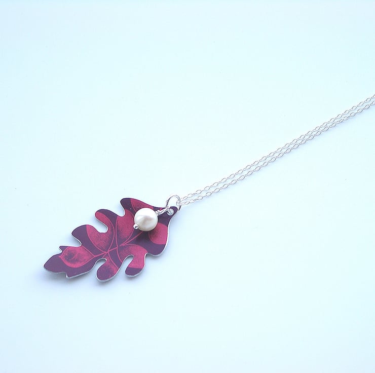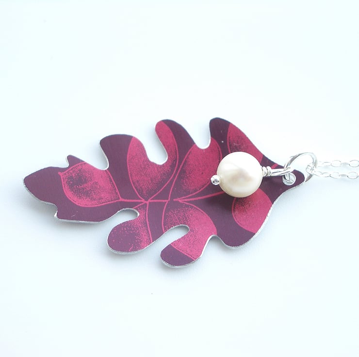 This oak leaf shaped pendant is made from anodised aluminium which I have dyed a deep plum with red leaf prints, sealing in the dye to make it permanent. I cut out the leaf shape with a piercing saw and file the edges to reveal the bright silver aluminium underneath. Finally I have domed the leaf inward and added an acorn-like creamy white pearl.