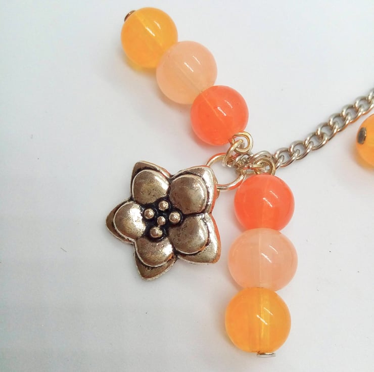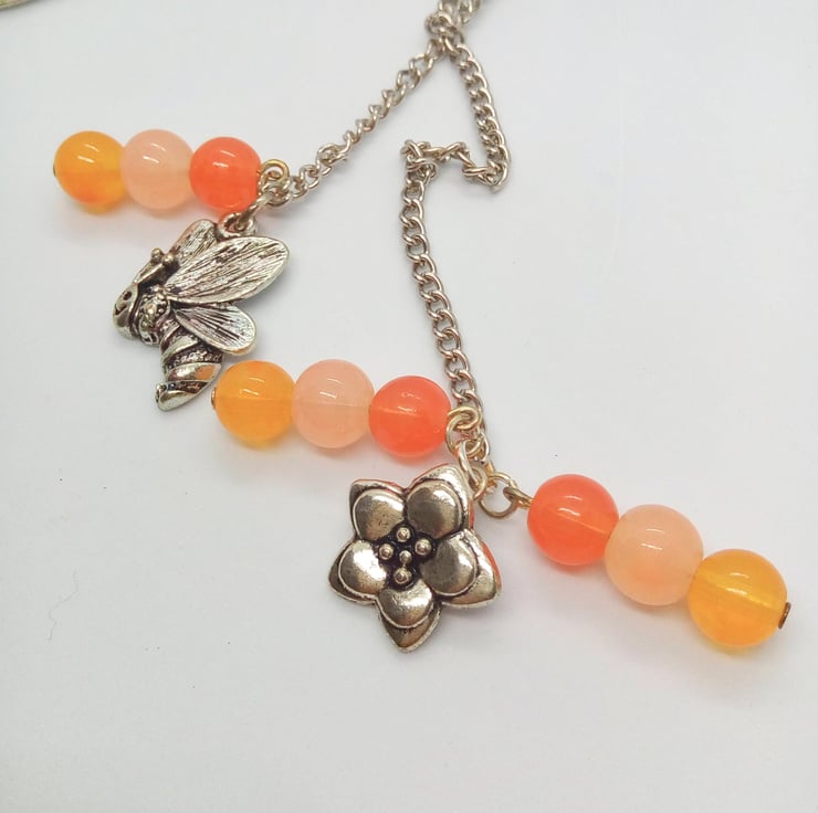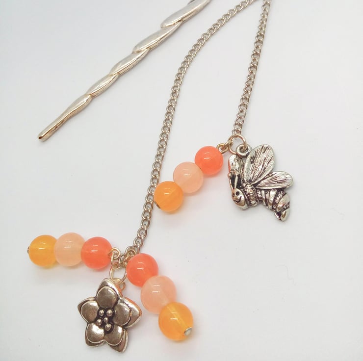 The bookmark is silver plated and in the shape of a fish. It has silver plated bee and flower charms and with orange, yellow and pink honey shades of 8 mm round glass beads. These are suspended from 2 silver plated chains.