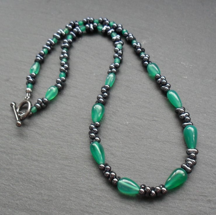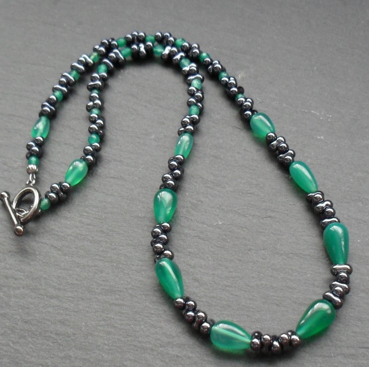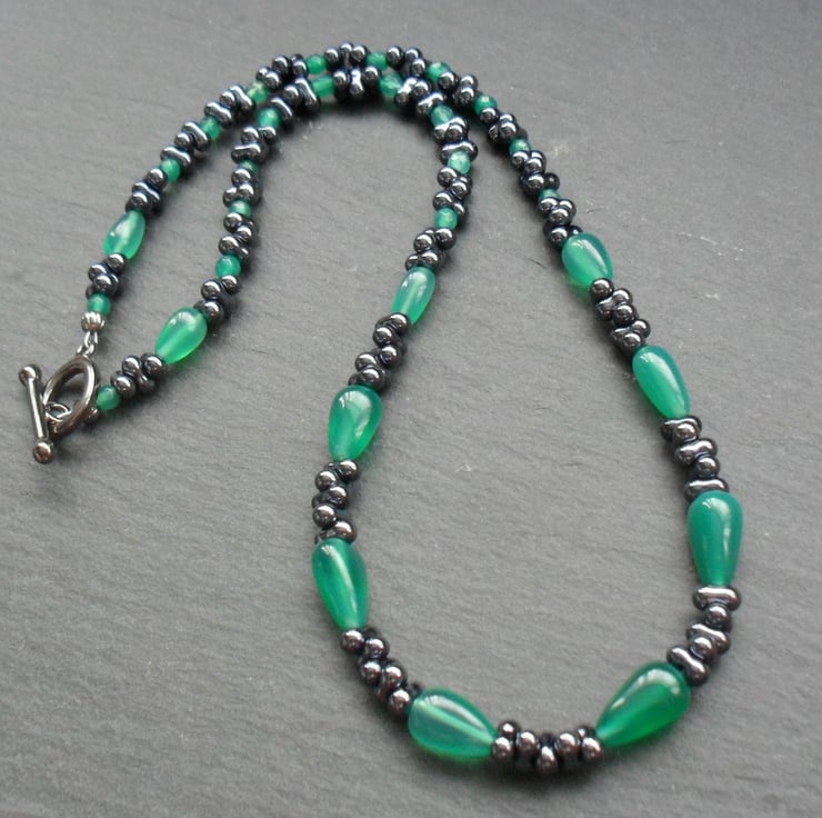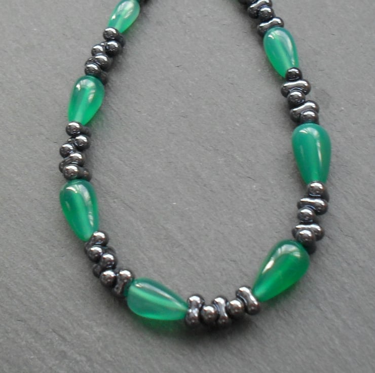 This necklace has been made with beautiful green onyx, very dark blue almost black in colour seed beads and small faceted green agate.