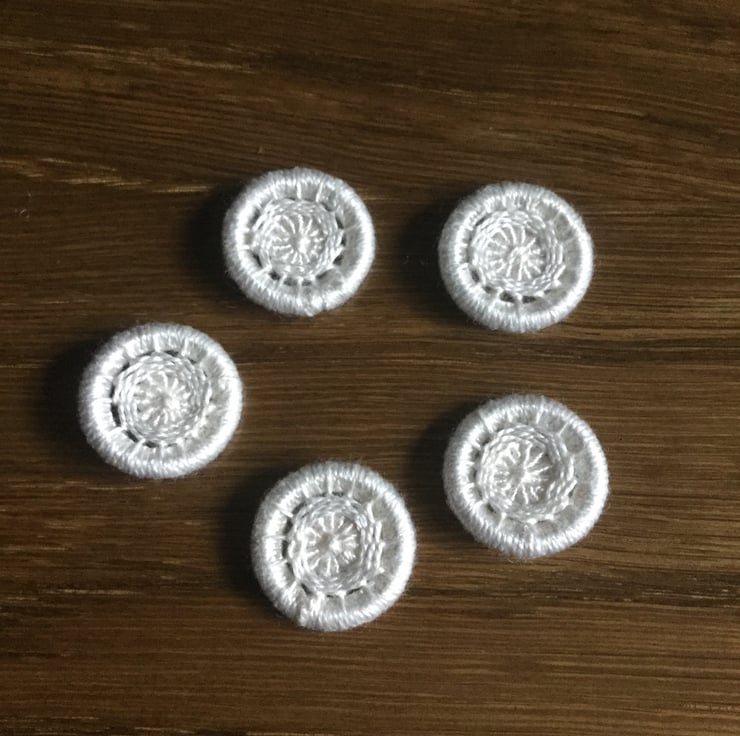 This set of hand worked Dorset Cross Wheel Buttons is created using ivory coloured cotton thread in the traditional Yarrell design.