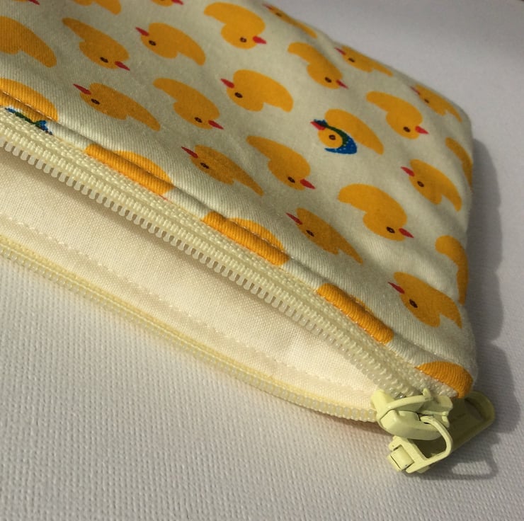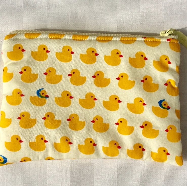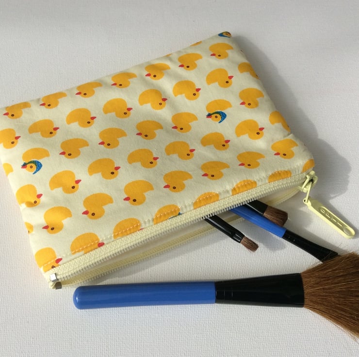 This make up bag is made from a cream cotton fabric with rows of yellow ducks.The bag is lined with a cream fabric, is lightly padded and it has a cream zip. The bag measures approximately 16.5cm x 12cm.