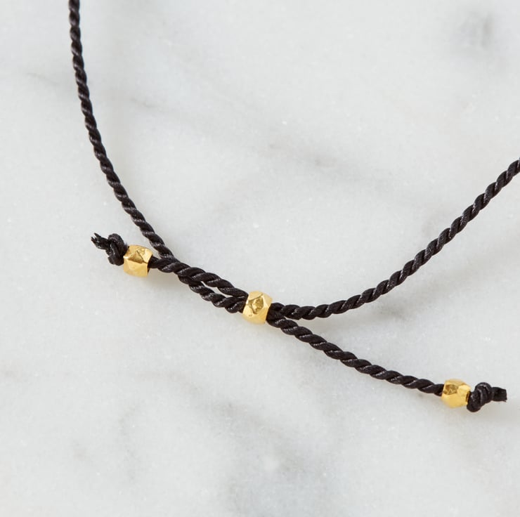 Delicate silk thread friendship bracelets with 18k gold plated sterling silver beads on a fully adjustable sliding cord.