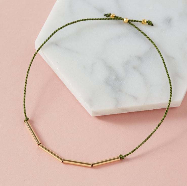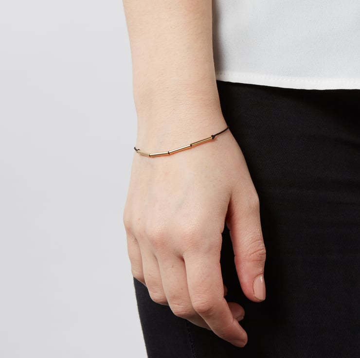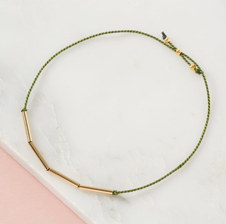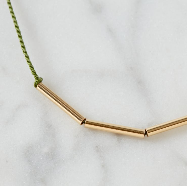 Four slim gold tube beads sit in the middle of black or forest green silk cord, fixed in place with hand-tied knots.