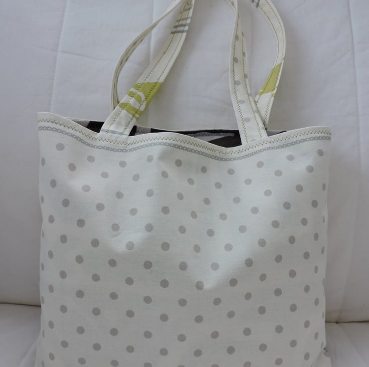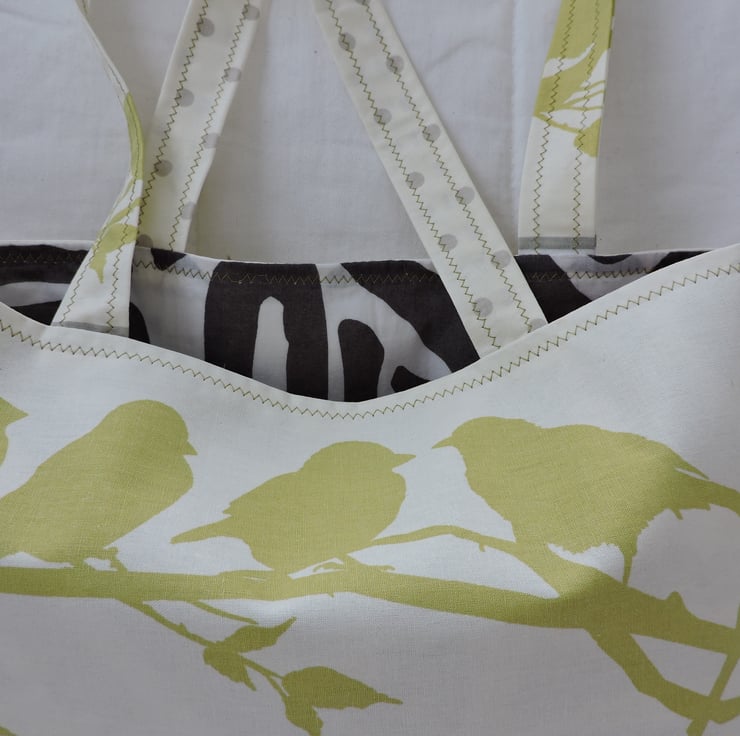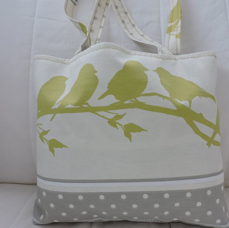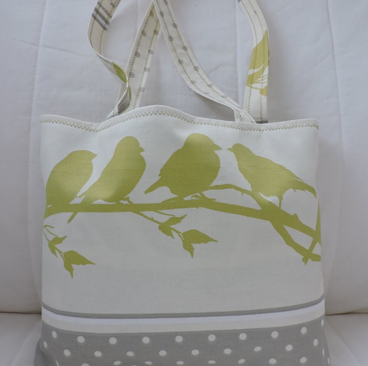I've made this tote bag with a cotton fabric depicting little pistachio coloured birds on a branch on a cream coloured background, and pale gray spots on a cream background for the back of the bag. Fully lined with a dark grey random pattern on a cream coloured background. . It has a squared off bottom, and interfacing to give the bag stability.