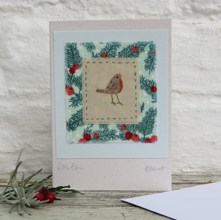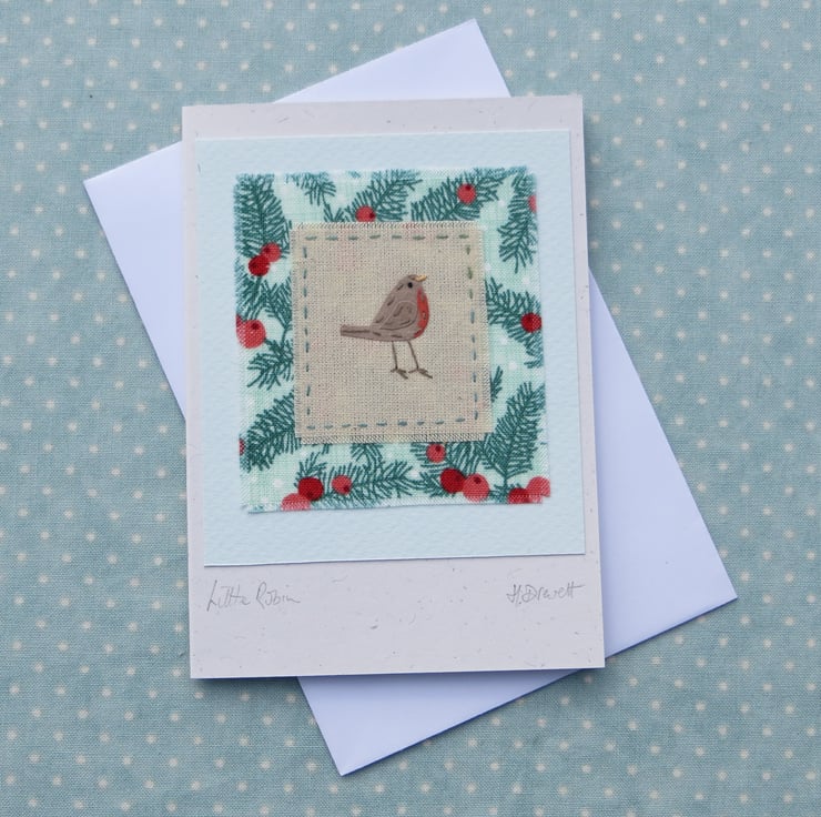 All my cards measure 12 x 9 cm and come with toning recycled paper envelopes in clear protective cellophane sleeves. Each card is signed on the front and my studio stamp is on the back. Cards are made from stout 100% recycled card - blank inside. The title is written below the textile: 'Little Robin'.