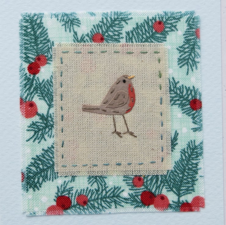 A miniature hand-stitched applique robin cut from hand-dyed cotton with intricate embroidered details. Backing is a lovely retro-style Christmas print cotton. Perfect for Christmas, a card to keep!