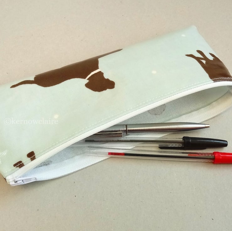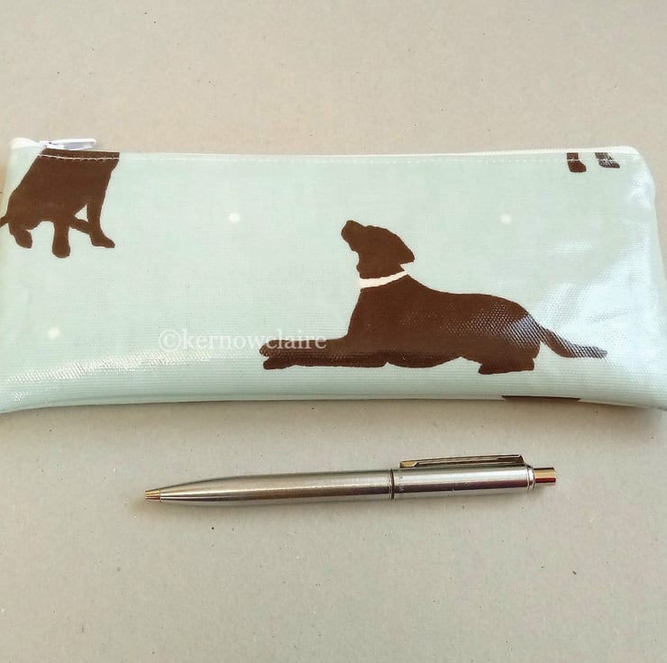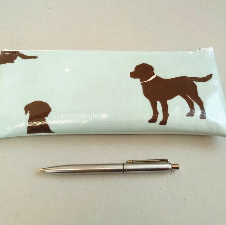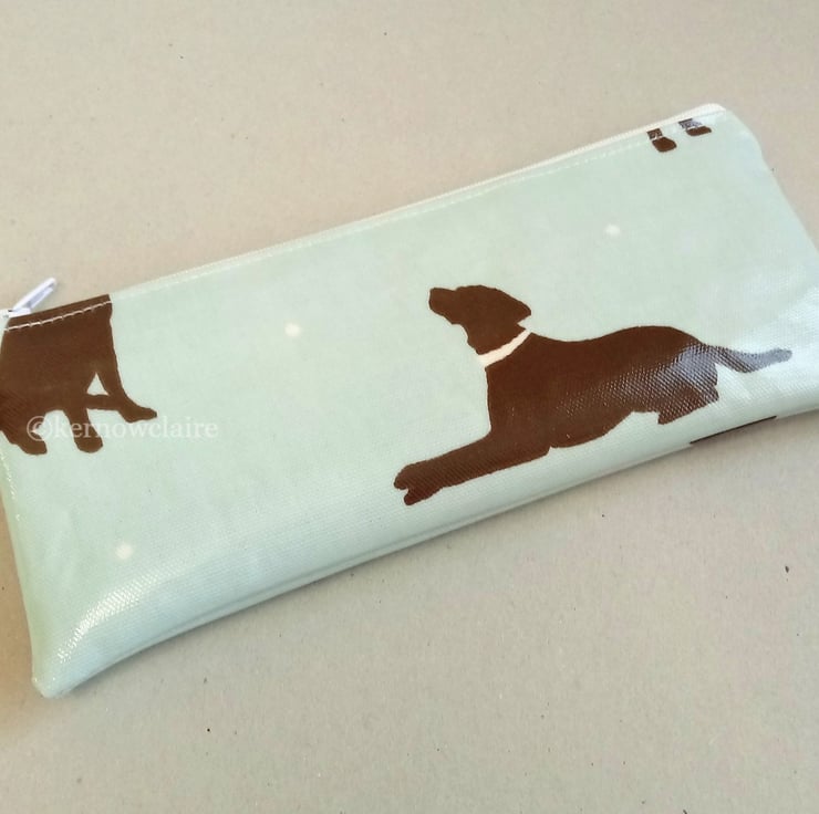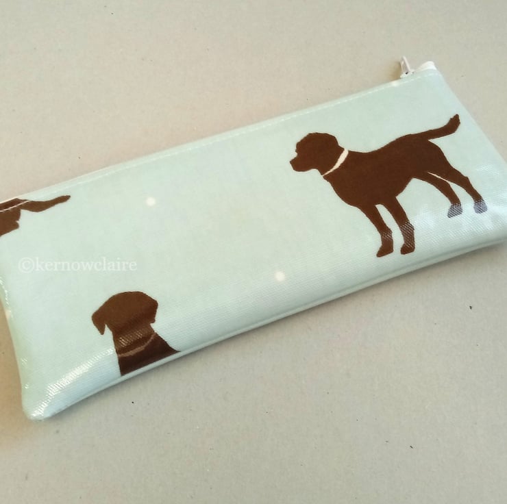 Handmade in a pale blue oilcloth with Labrador dog pattern