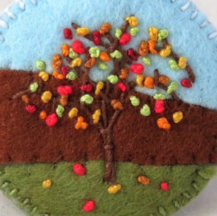 The background of the brooch has been created from felt. The tree has been stitched in cotton threads using simple embroidery stitches. The leaves are stitched in various cotton threads in pretty autumn colours.