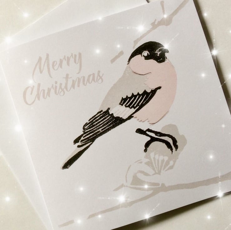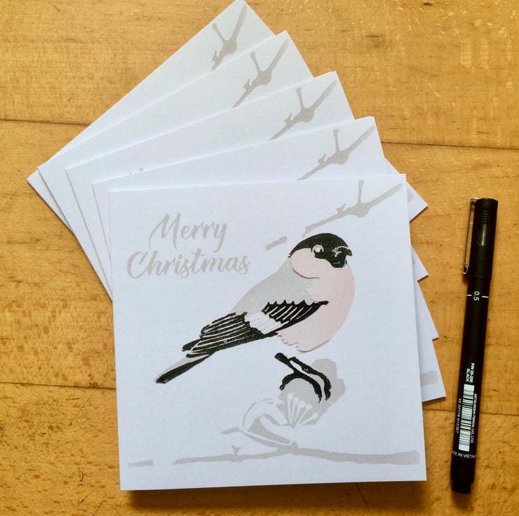 Pack of 5 cards featuring our bullfinch linocut & collage design