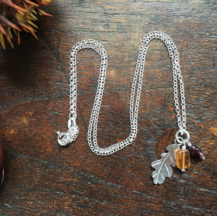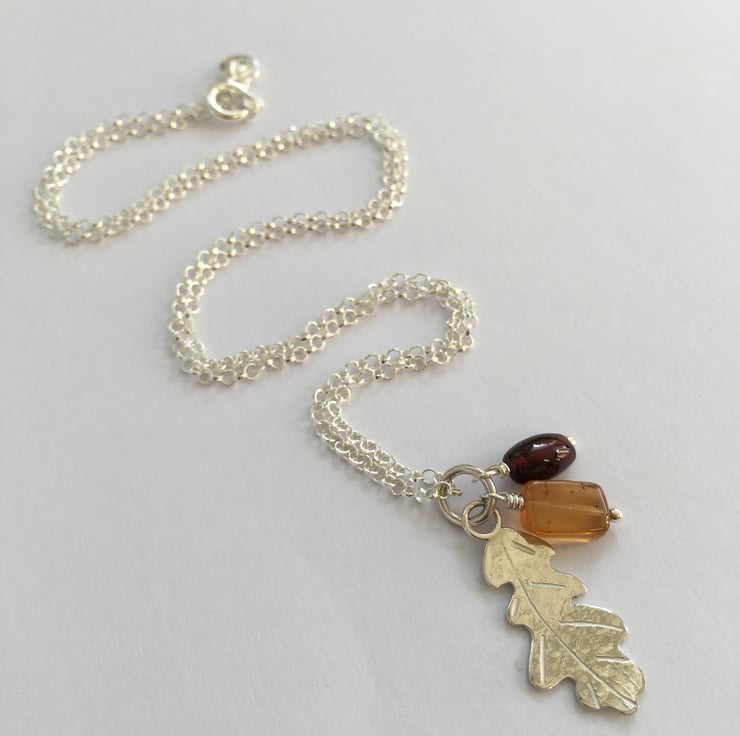 The leaf is 22mm in length, the rice bead 7mm long and the Hessonite garnet 8mm long. The pendant hangs on an 18 inch sterling silver belcher chain (stamped 925).