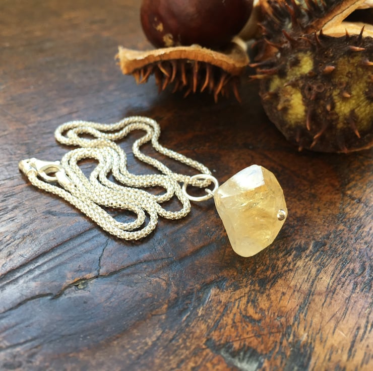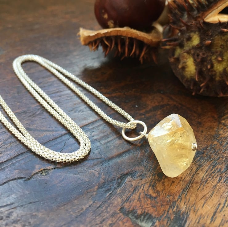 This lovely rough nugget of citrine is suspended on a sterling silver headpin from an 8mm sterling silver ring to create a lovely chunky pendant.