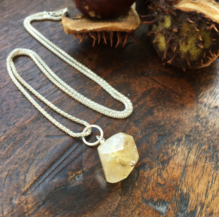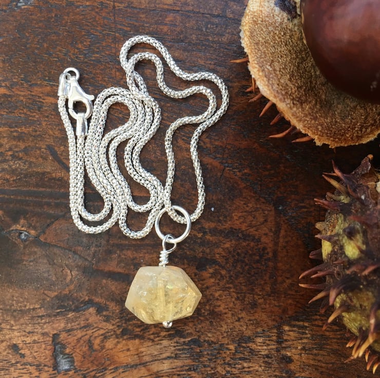 The citrine measures approximately 11mm in length and 16mm across at its widest point. It hangs from an 18 inch sterling silver popcorn chain which adds a little bit of sparkle.