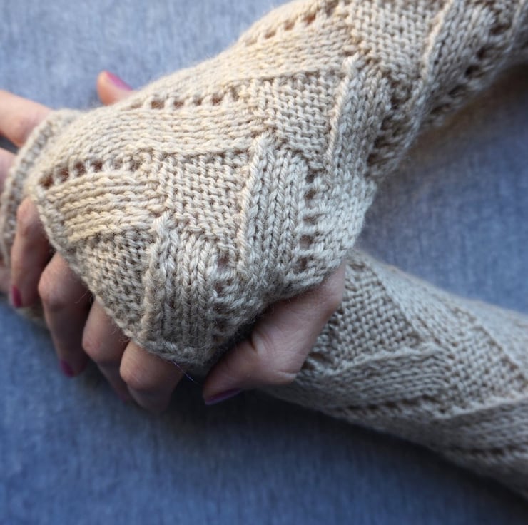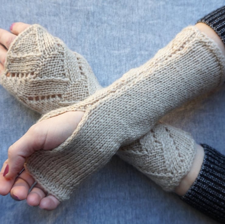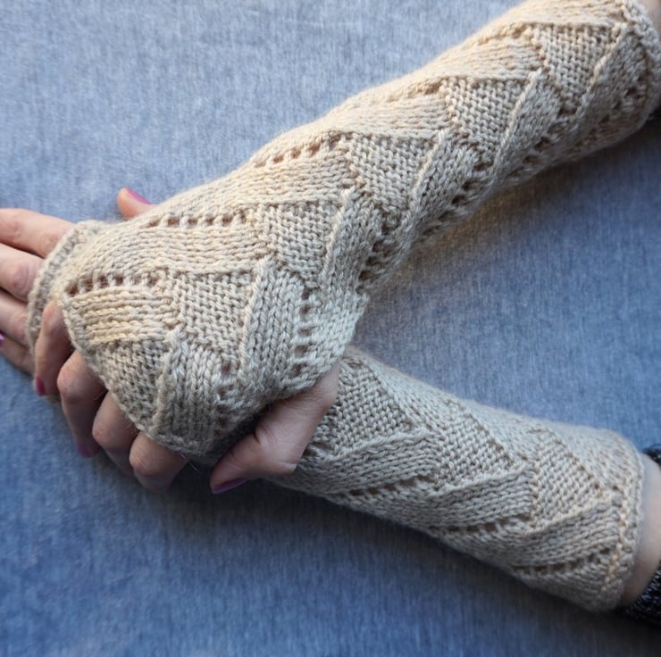 Handmade wool and acrylic Wrist Warmers Fancy pattern Knit fingerless gloves, driving gloves in light brown, beige colour