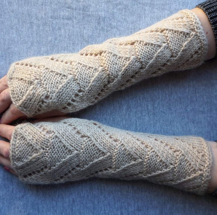 These wrist warmers are hand-knitted with 75% wool and 25% acrylic yarns from New Zealand.