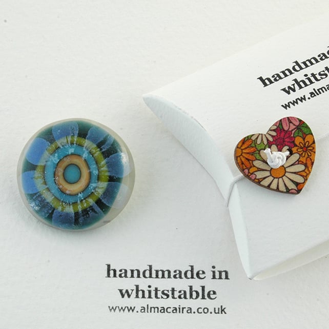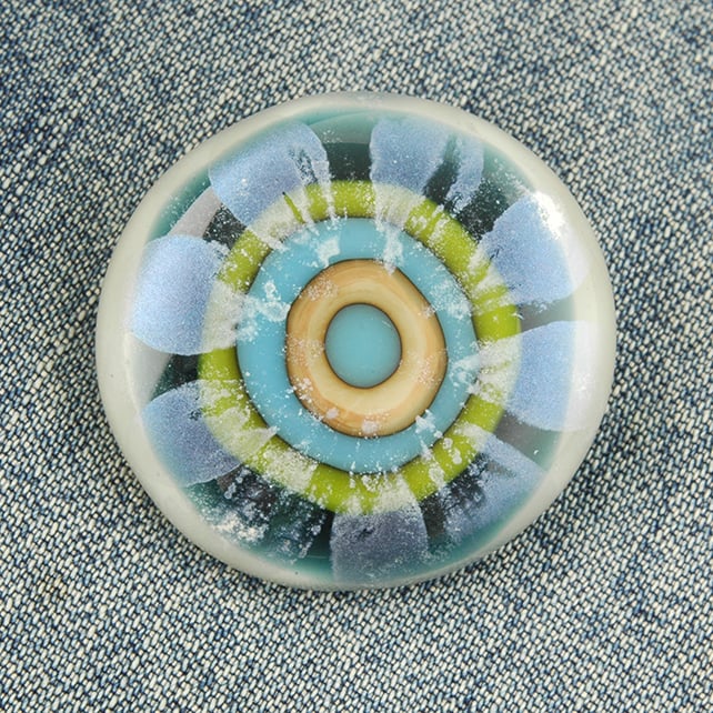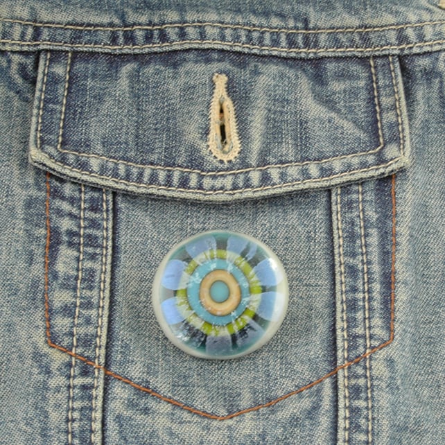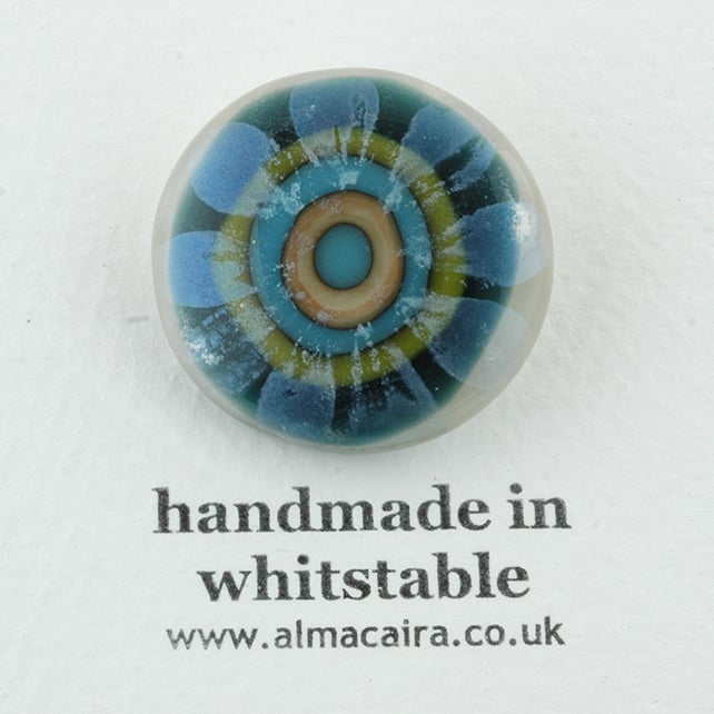Created from layered Bullseye glass in my Whitstable workshop. The flower's petals are painted with pale blue mica powder which gives a lovely shimmery effect over glossy concentric circles. Plated sterling silver brooch back glued with epoxy resin to create a permanent bond. Supplied with a recycled card gift box (sent flat for postage but very simple to assemble).