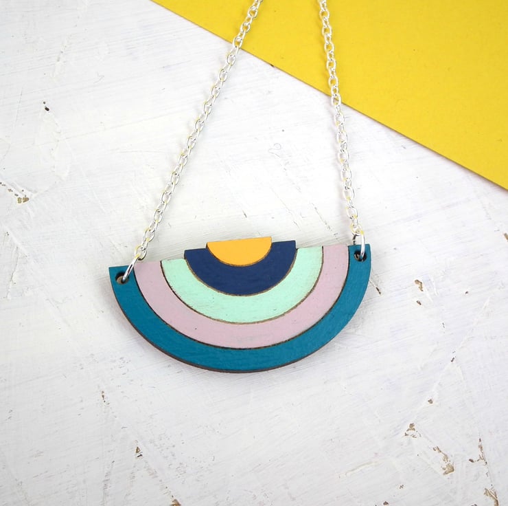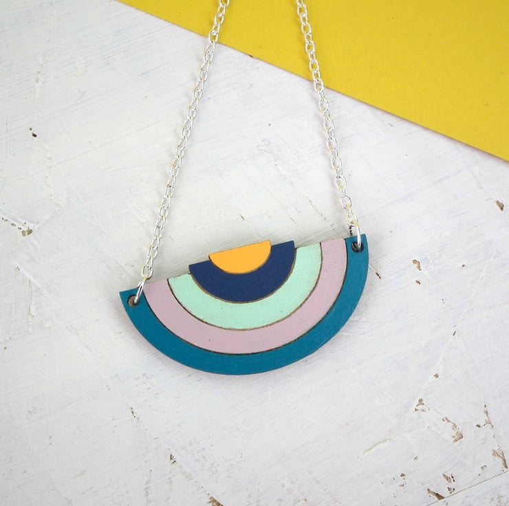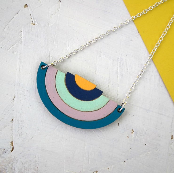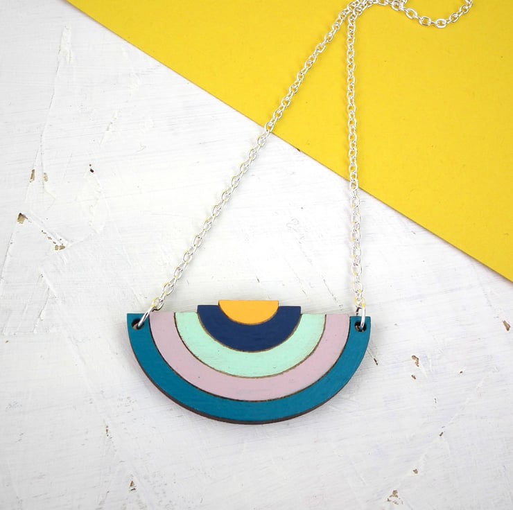The necklace is laser cut in the UK from responsibly sourced birch wood and hand painted in a selection of bright colours with a geometric style.