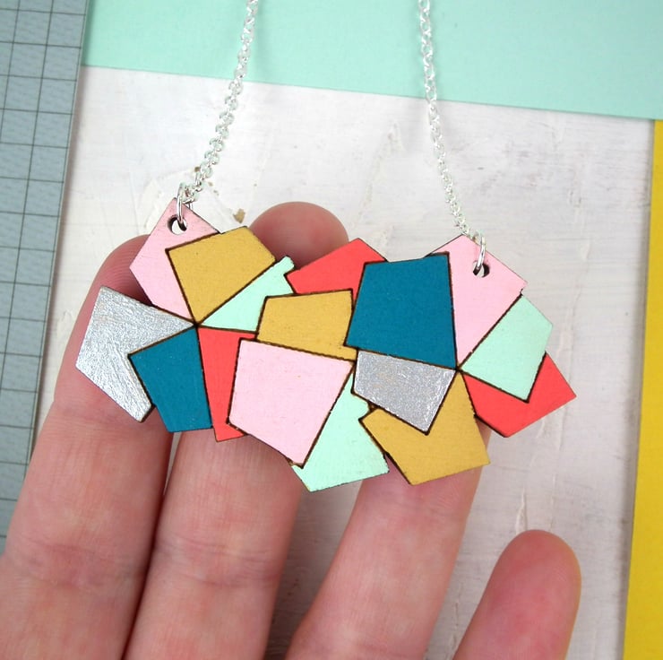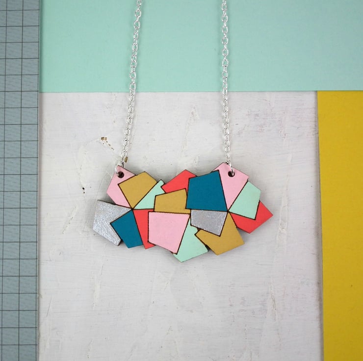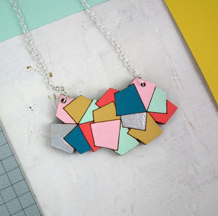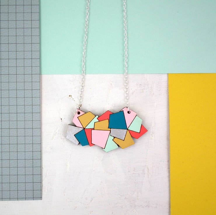 This contemporary and colourful wooden necklace has been created from an original hand drawn image, digitally manipulated and stacked to create a bold and contemporary necklace pendant.