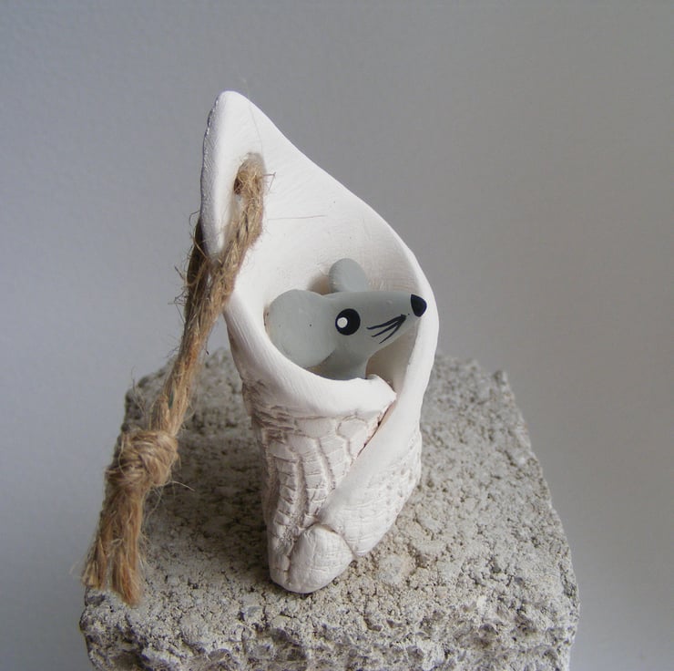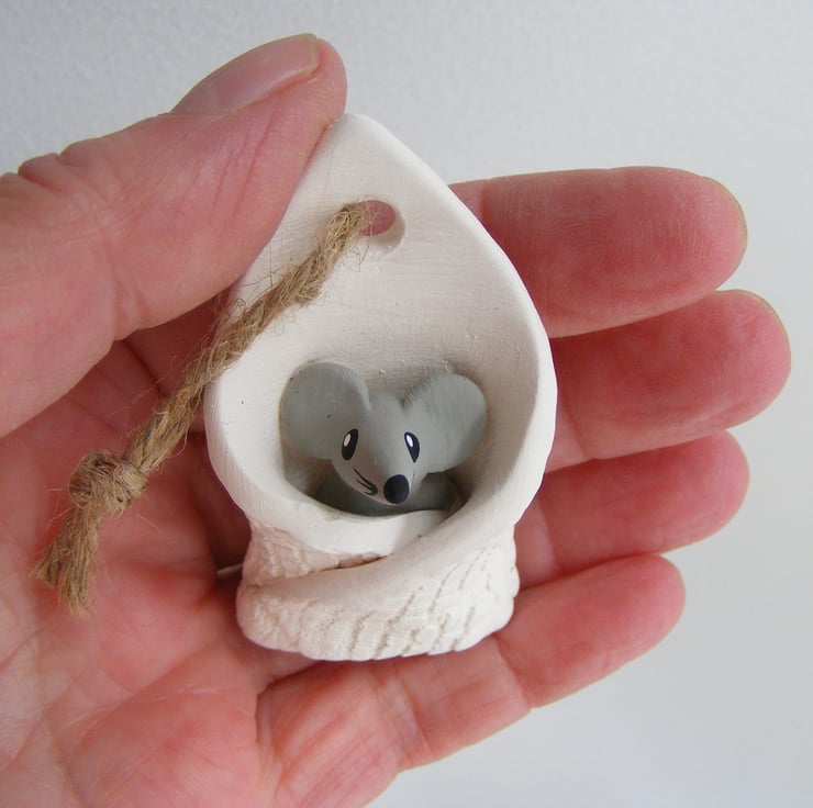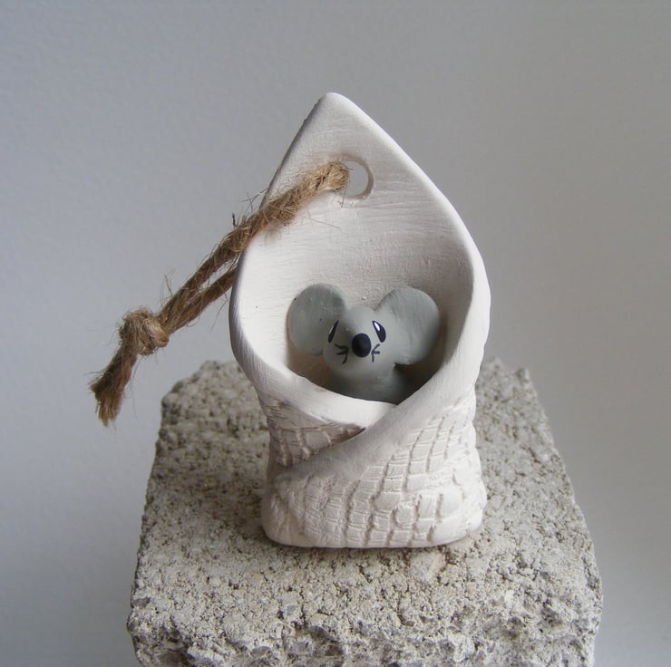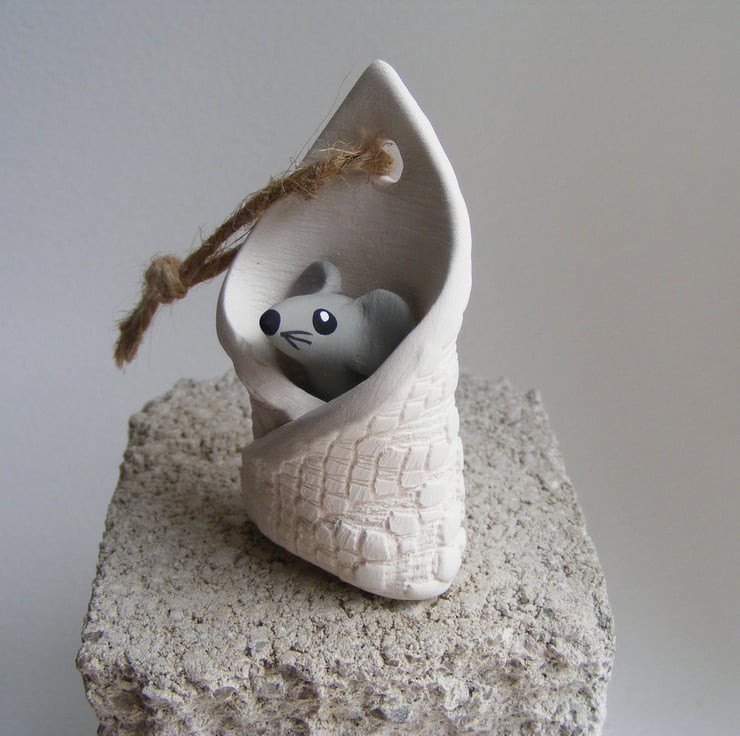 This little mouse has been wrapped up in a blanket, all nice and cosy. It measures approx 6 cm long and 3.5cm wide. It is made of white earthenware clay, I modelled the mouse first then rolled out a piece of clay and impressed a piece of lace in to it, I then wrapped the mouse up, used a drill to make the hole for the string to hang it up, it does stand alone. After firing I painted the mouse with acrylic paints