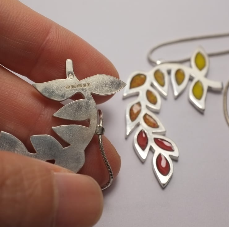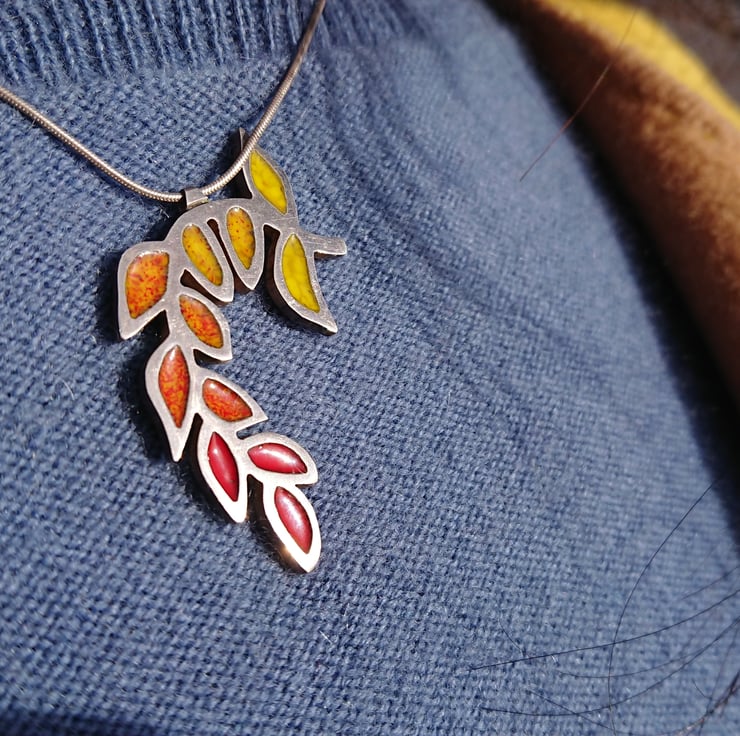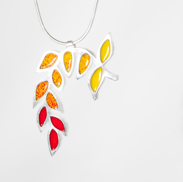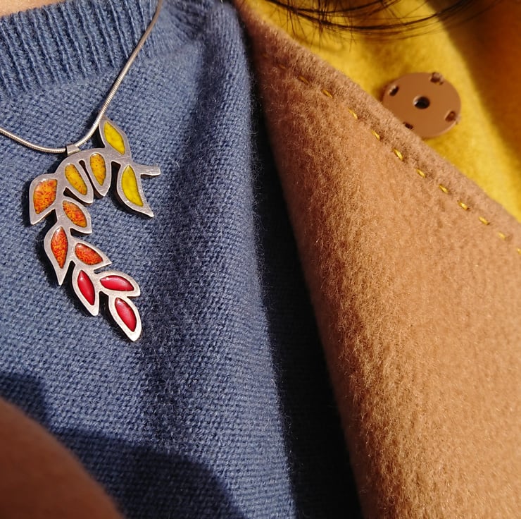 This stunning enamelled silver necklace has an softly elegant foliate curve reflecting nature. The individual leaves are carefully enamelled from yellow through ochre to brilliant red as though bright sunlight is striking the top of a sinuous branch falling gracefully into deep shade. It's an endlessly versatile piece of jewellery as the colours complement winter wear as well as summer colours and its outstandingly distinctive design suits daywear or evenings.