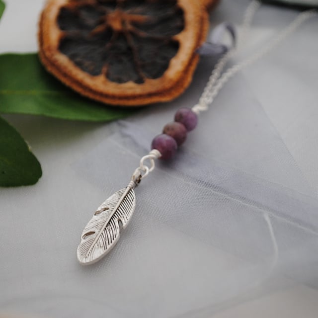 This necklace features three pretty amethyst beads and a silver-plated leaf charm.