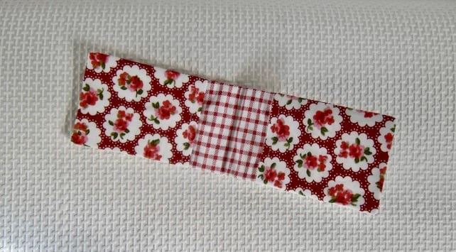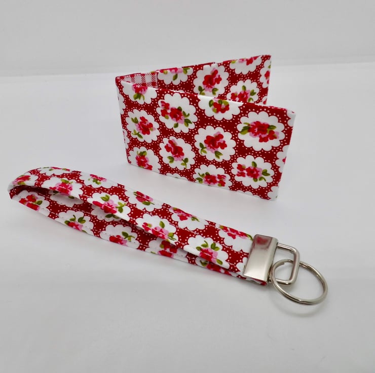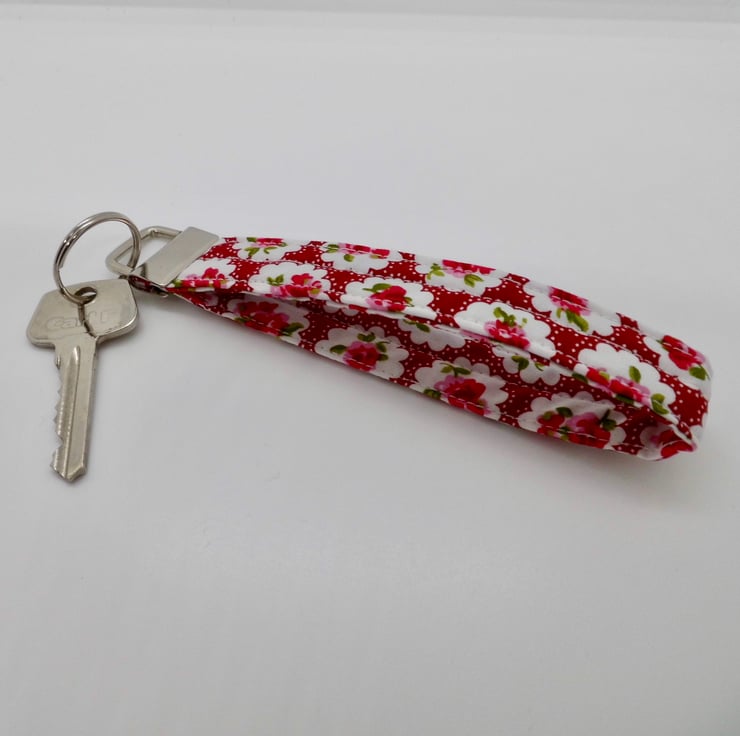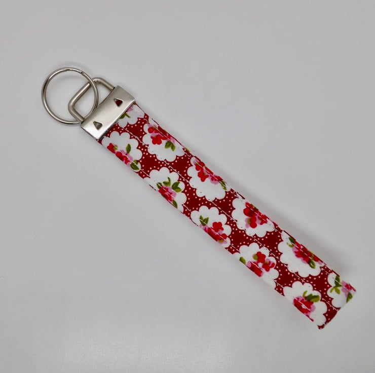 A wrist strap keyring in pretty pink and red floral fabric. I added a layer of lightweight quilters fleece inside. Top stitched with white thread and has a silver tone key ring at the end. Measures about 5 inches when laying down flat, so 10 inches all the way round.