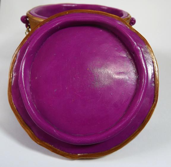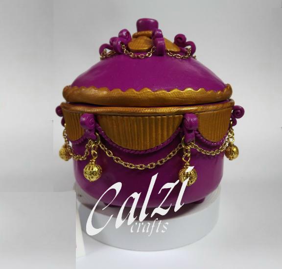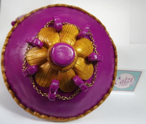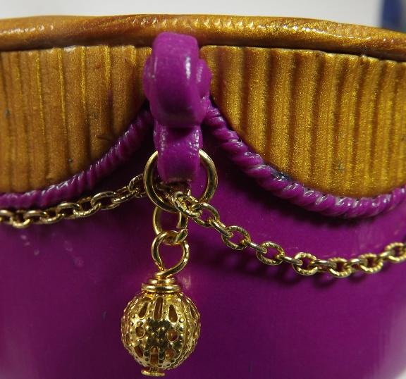 This base of this round trinket box was formed around a tin using purple polymer clay, I then added a decorative border in gold clay. In between the border panels are curled elements with loops to which I have added gold filigree beads and a pretty fancy chain. It is 4cm deep, and lined with felt.