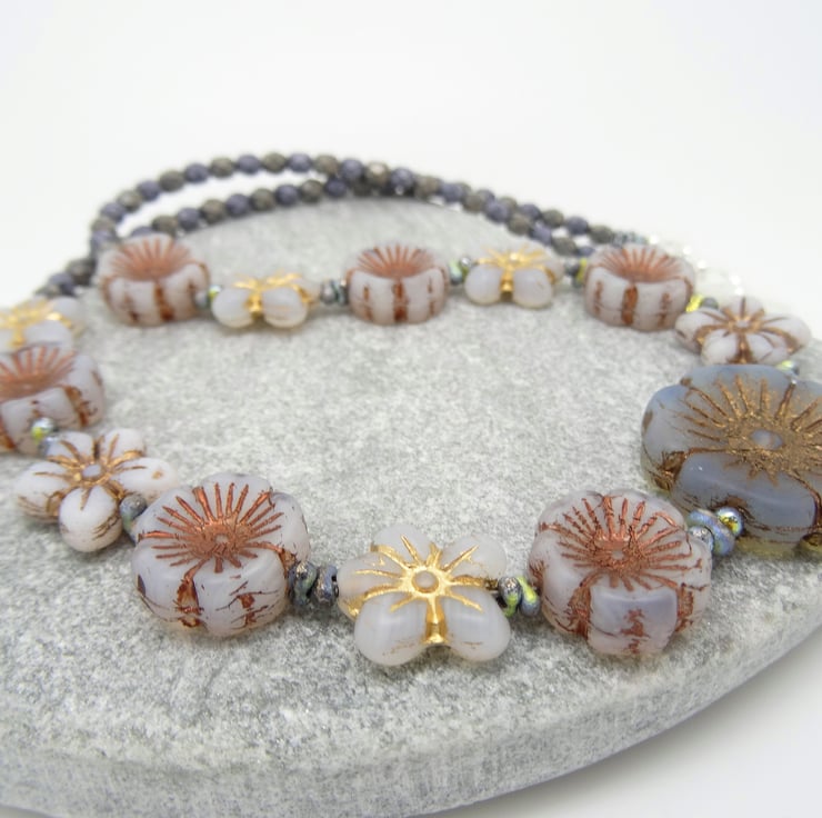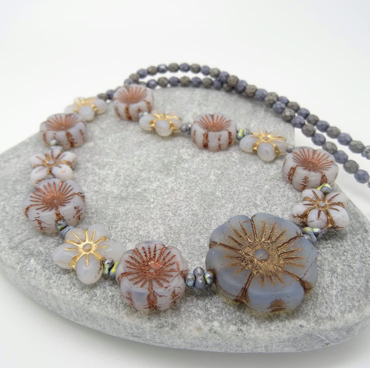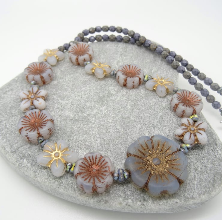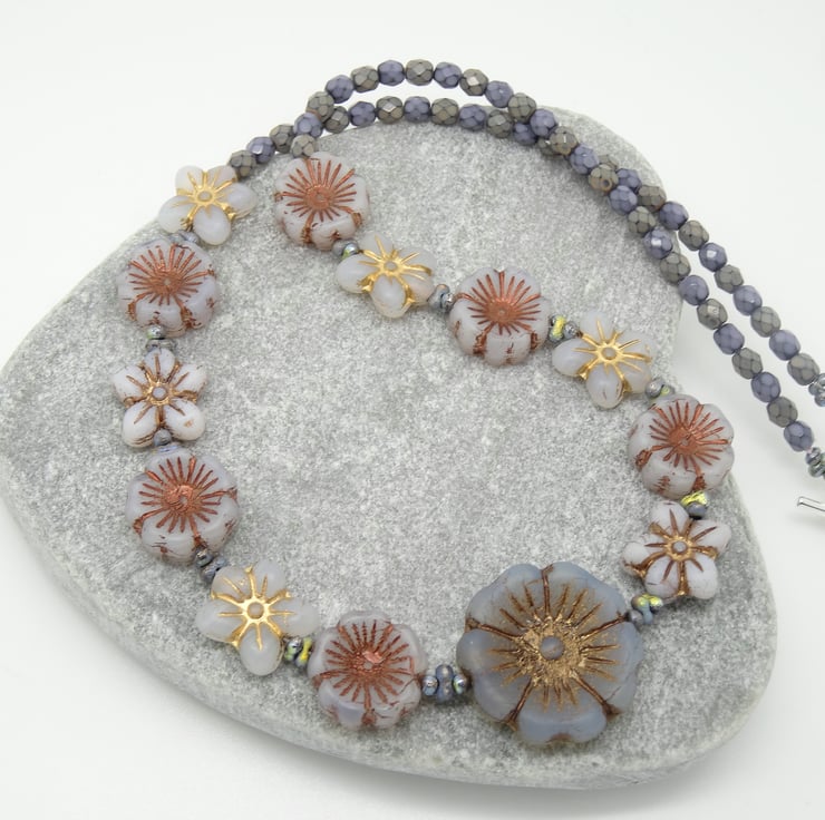 This is a lovely necklace made with czech glass high quality flower beads in different shades of grey and the palest blue. I have used 14mm czech glass opaque pansies in pale grey with a bronze centre, 13 x 12mm opaque czech glass daisies in pale grey and winter white and 3mm faceted czech glass bicone beads in grey. For the focal of the necklace I have used a 20 mm czech glass frosted opaque flower beads in the very palest of blues also with a bronze centre. The necklace measures 19 inches (48cm) and closes with a silver plated toggle clasp.