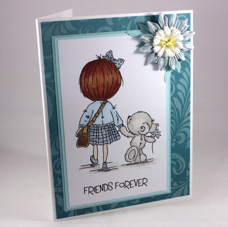Blank, any occasion card to send to your best friend, featuring a cute, hand coloured, image of a girl holding hands with her bear friend. The sentiment printed below reads 'Friends Forever'.