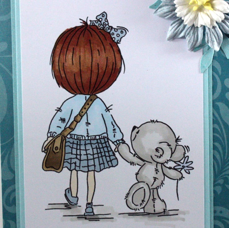 The image has been layered over two coordinating pieces of card over a teal patterned background. The card is embellished with paper flowers.
