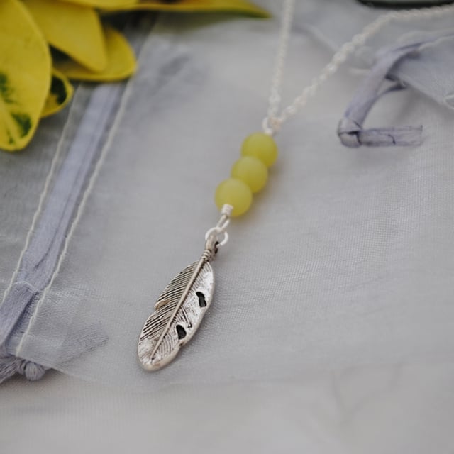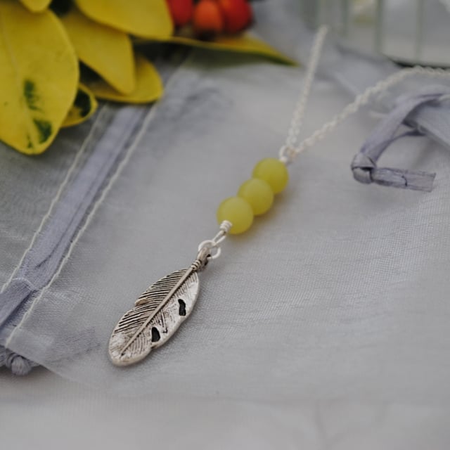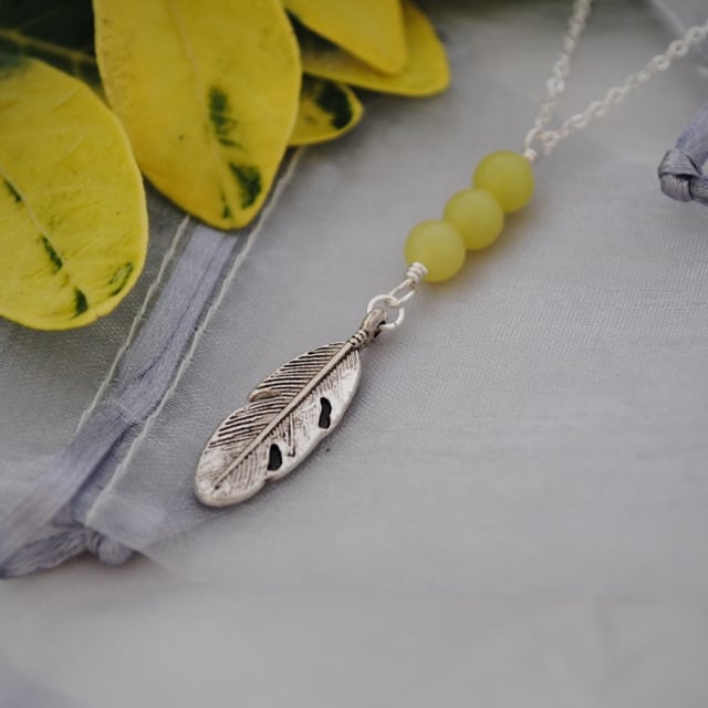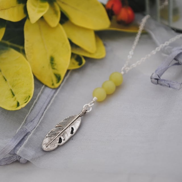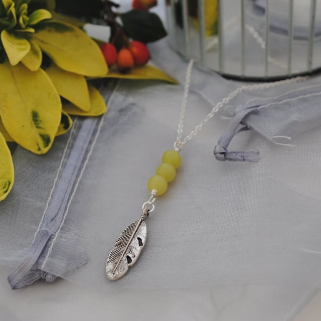 This necklace features lime jade beads and a silver-plated leaf charm.