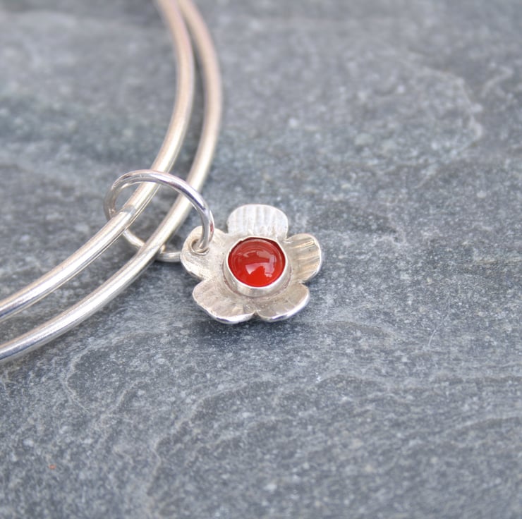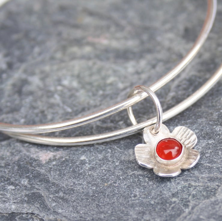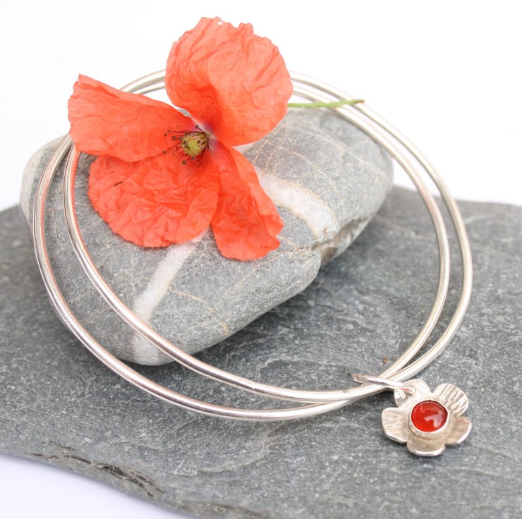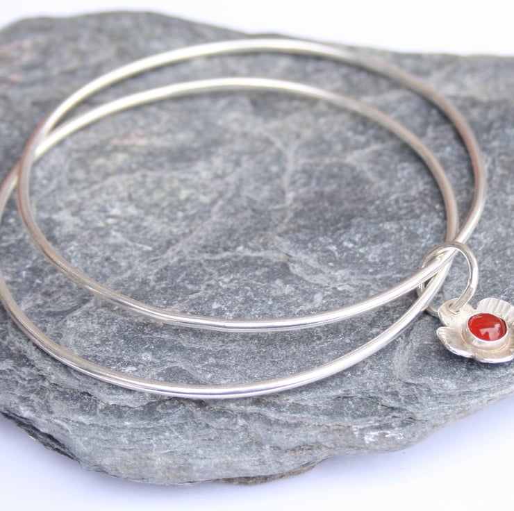 These sterling silver bangles are joined together with a domed silver flower which has a carnelian gemstone in the centre. A flower bangle would make a great nature lover gift or gardener gift and the red carnelian would perfectly suit a Christmas outfit.
