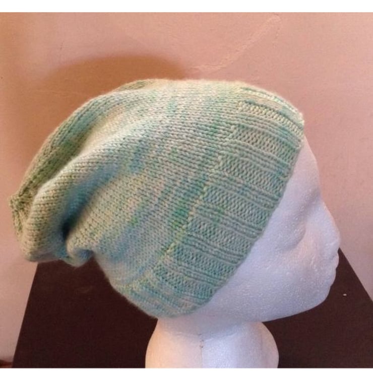 Slouch beanie hat. Peppermint green tonal hand dyed merino nylon dk yarn. Brim measures 32cm all round but will stretch a little. Length 25cm. Will fit child or small teenager . Hand knit in hand dyed merino nylon yarn. Hand wash. One of a kind. I hand dyed this yarn myself. The final photo shows the yarn before knitting up.