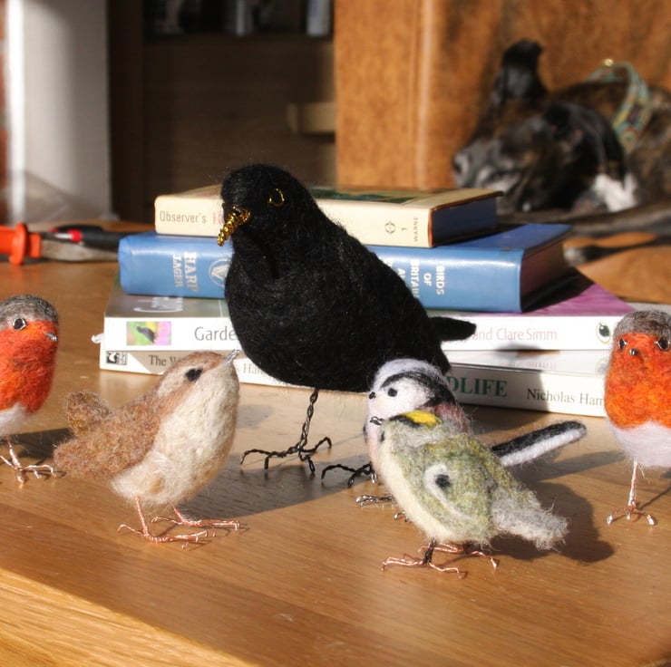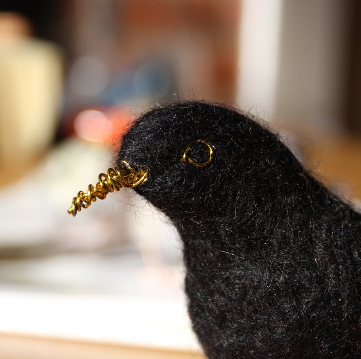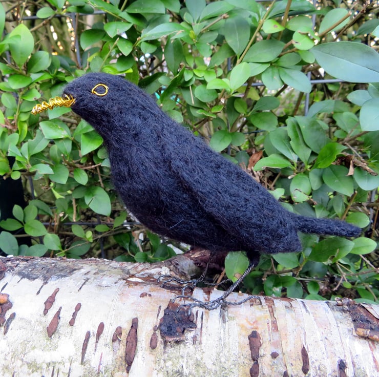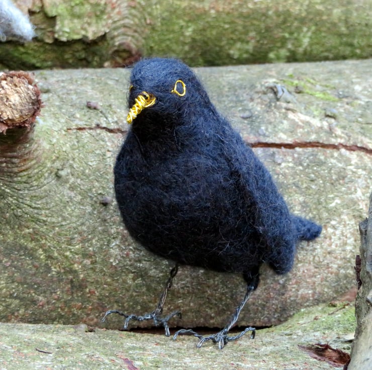 This freestanding blackbird is needle felted over a wire framework for extra stability, with wire feet, beak and eyes.