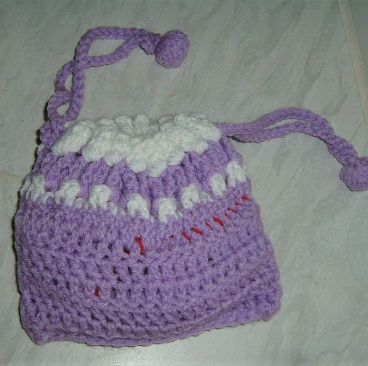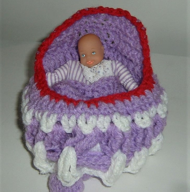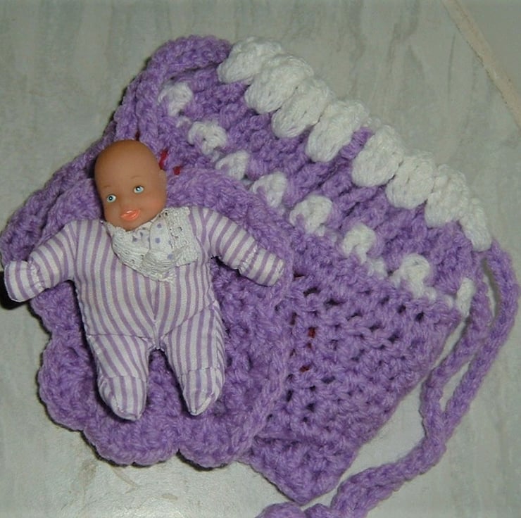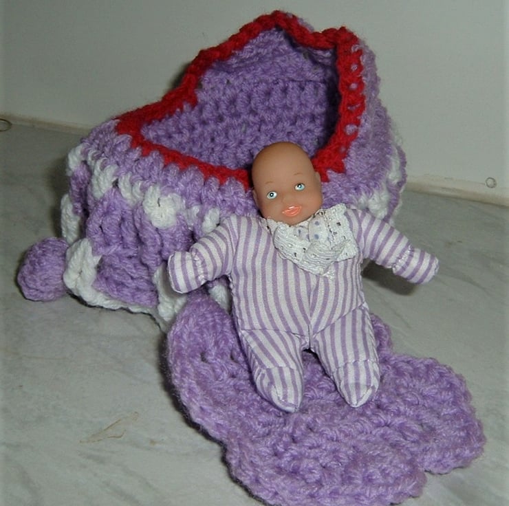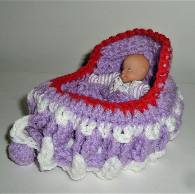 this cot has been crocheted to my own pattern and comes complete with a tiny doll and blanket