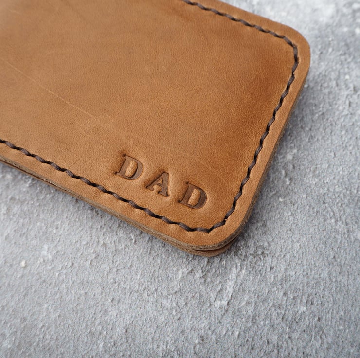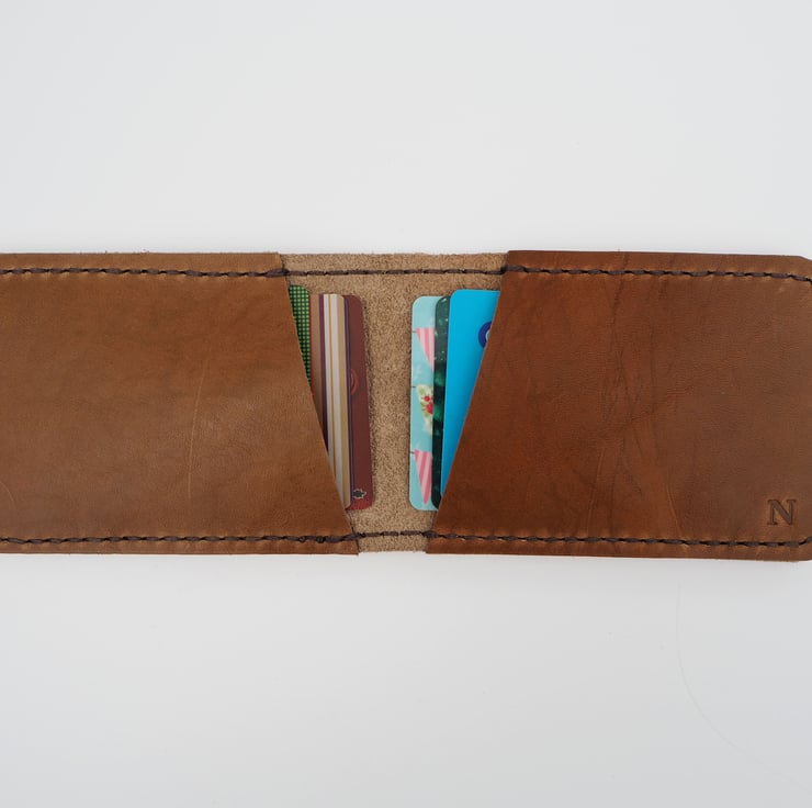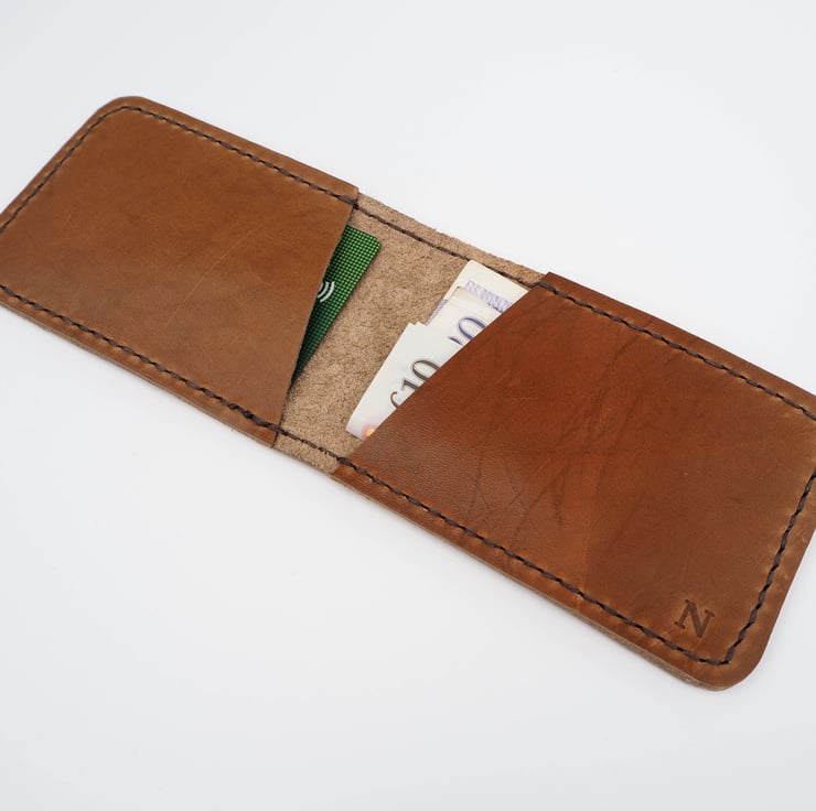 Hand made from tan brown Italian leather in our small workshop in Derbyshire. Stitched entirely by hand using dark brown waxed thread. Each wallet will differ slightly in appearance due to the nature of the leather we use. Please note each personalised letter is stamped by hand so there may be some tilting etc. this is all part of the handmade process.