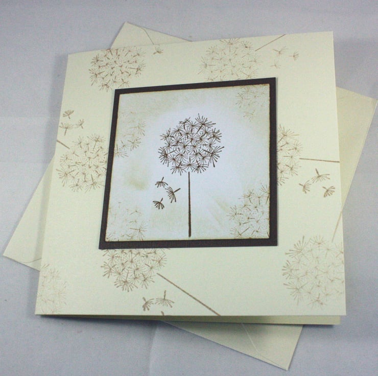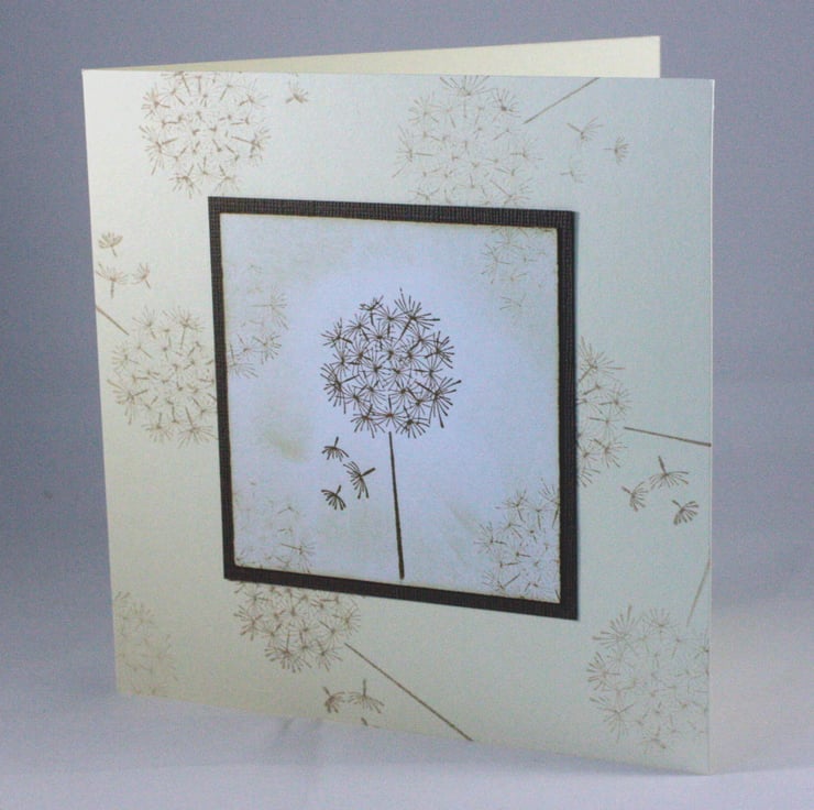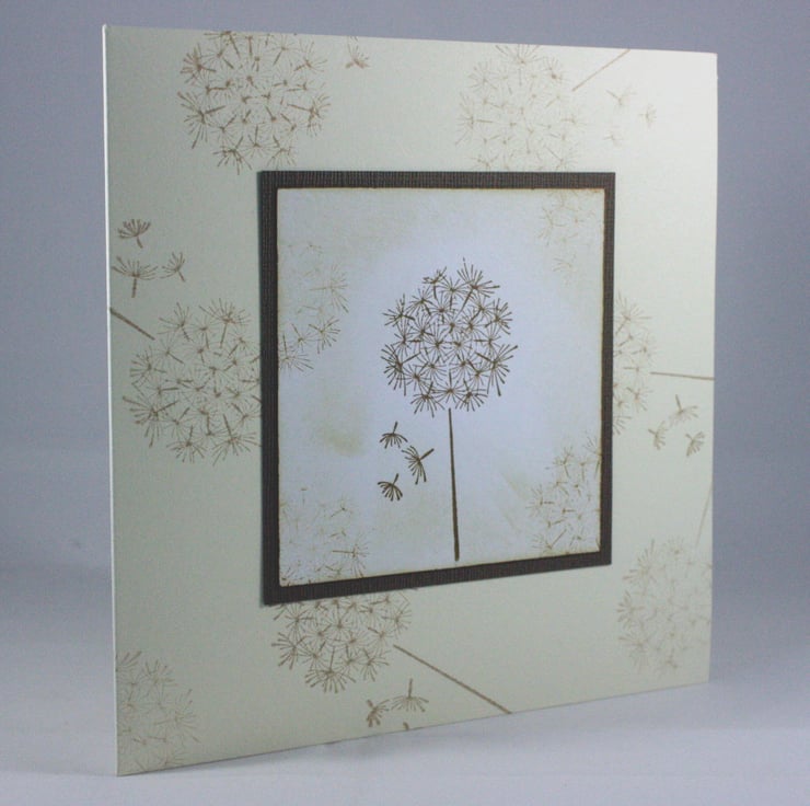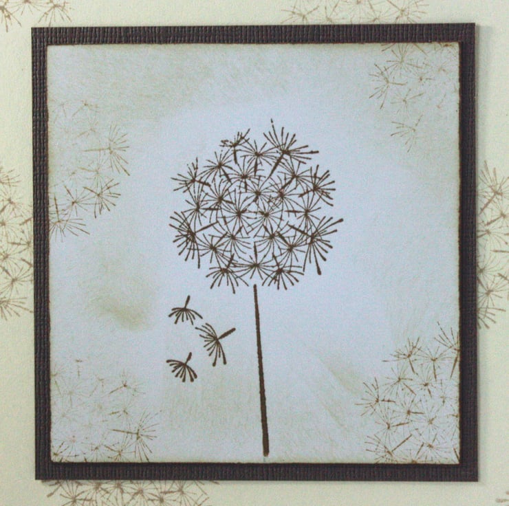 Square cream card featuring a hand stamped image of a dandelion clock. The image has been overlaid onto dark brown card. The base card has been stamped with the same image.