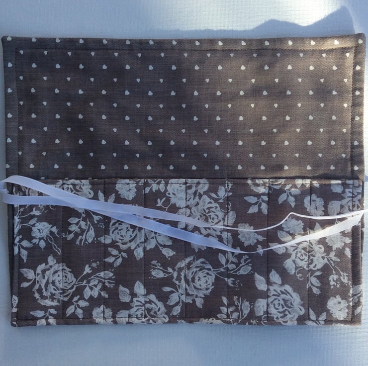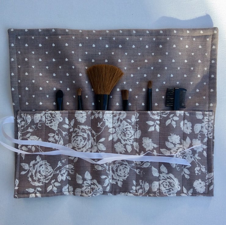 This Make up brush roll is made from two matching grey cotton fabrics, one has white roses the other small white hearts. The roll has 8 x 3cm pockets, 10cm deep. The flap can be folded over before rolling and securing with the white ribbon. Overall open dimensions are approximately 21cm x 25 cm . (Brushes for display purpose only and not included in the sale.)