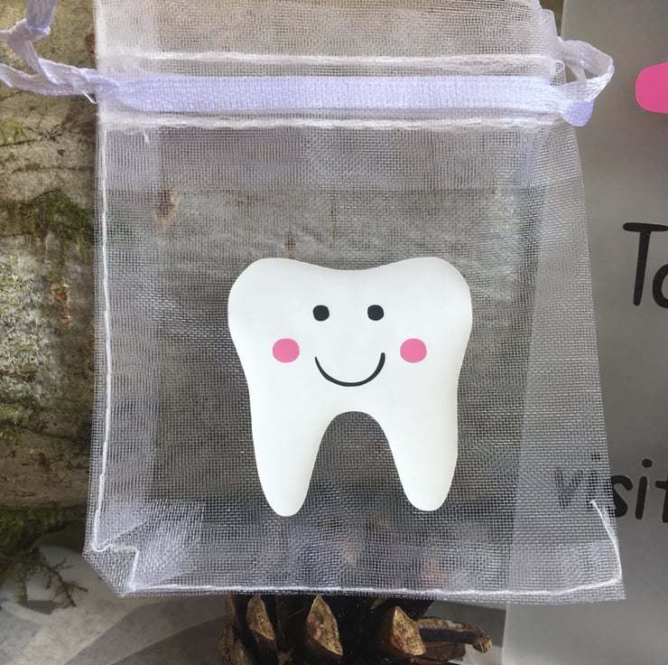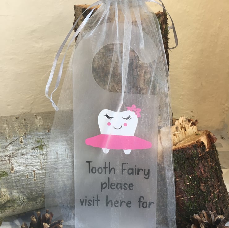 The organza bag design has been created using high quality professional clothing vinyl. It also features a large white tooth with rosy cheeks and a big smile.