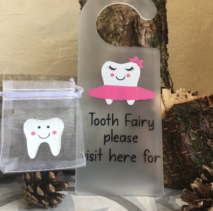 Tooth Fairy gift set containing small tooth bag and personalised please visit here door hanger