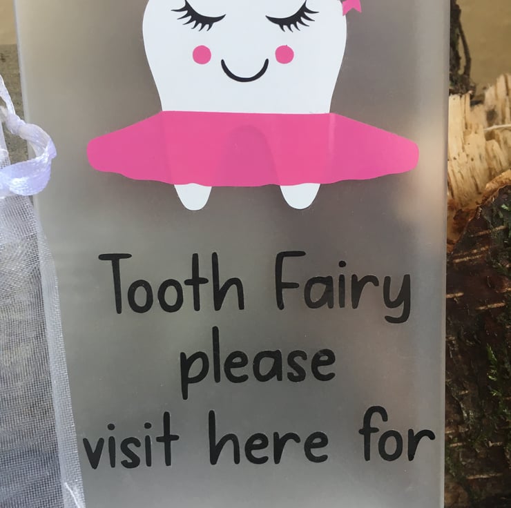 The door hanger design is created using high quality professional sign vinyl. It features a large white tooth wearing a vibrant pink tutu and a pretty pink bow in the top right corner. It also features long eye lashes and rosy cheeks. The text featured on the design reads 'Tooth Fairy please visit here for' and leaves space for personalisation - this will be in the text colour black.
