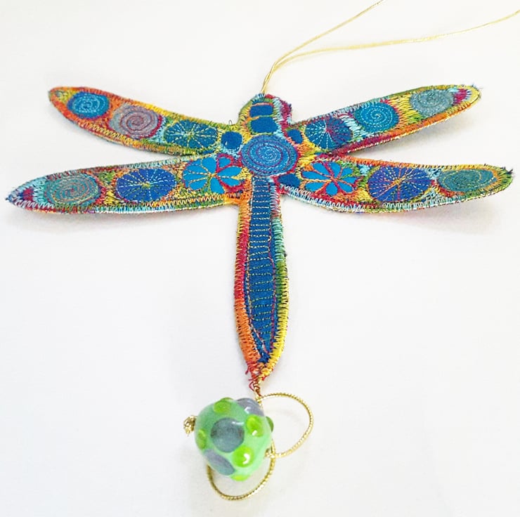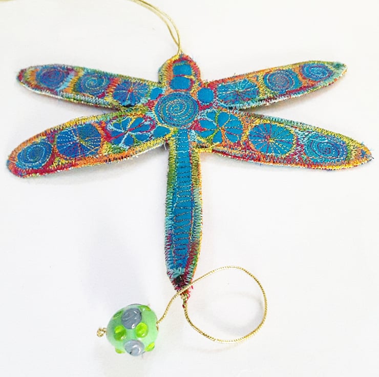 This is a handmade machine stitched fabric dragonfly hanging decoration