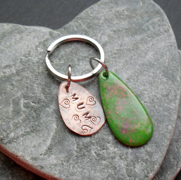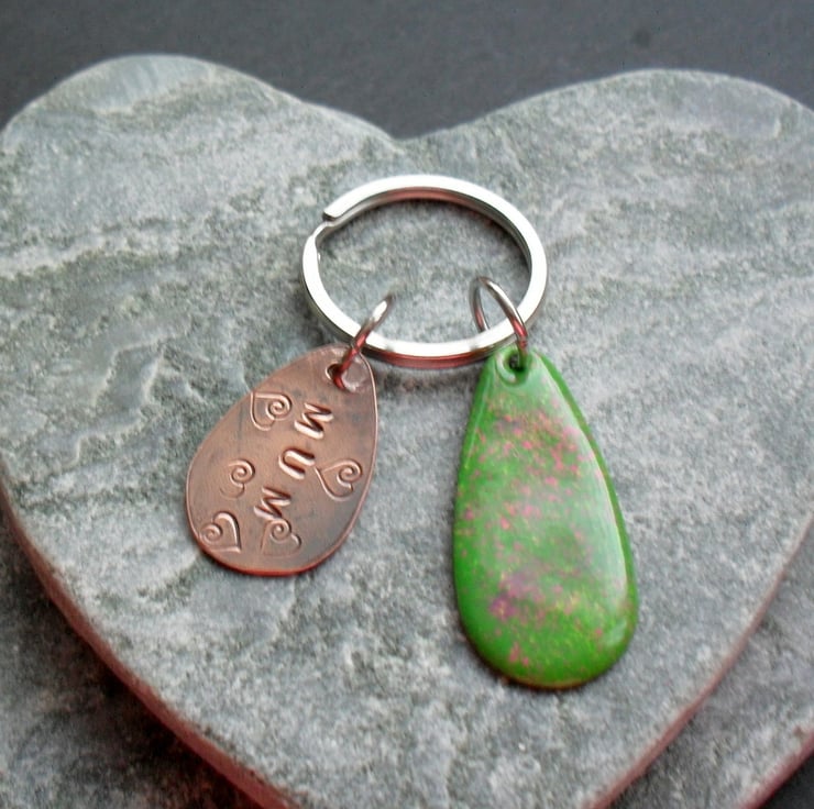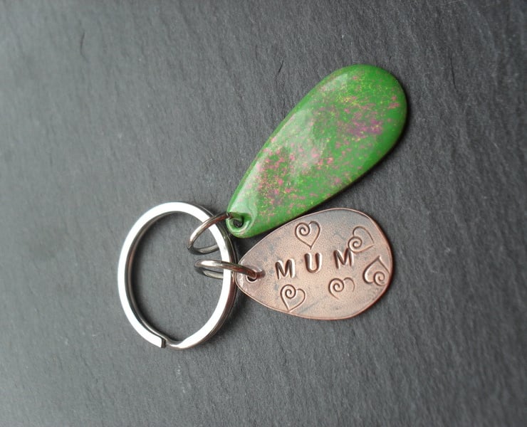 This keyring has been made with copper which has been hand stamped with mum and hearts The copper has then been oxidised to give an aged look.This piece of copper has then been given a coat of renaissance wax.