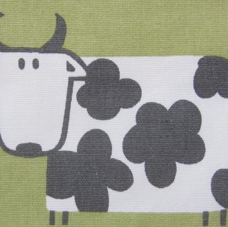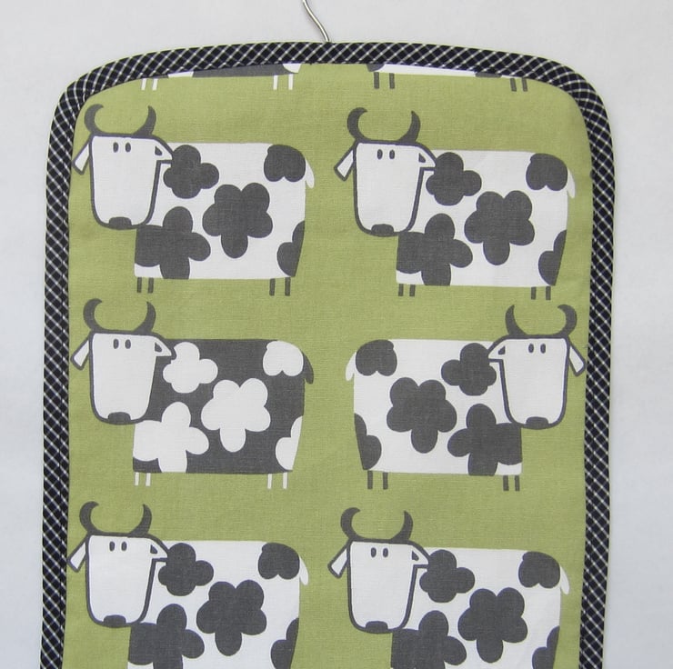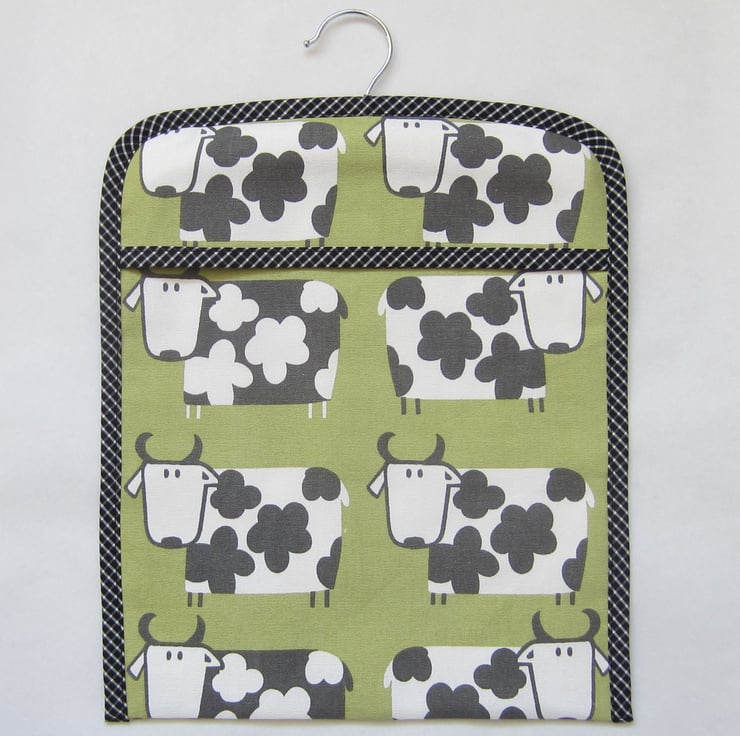 Sturdy peg bag in black and white cows on lime green background fabric. It is edged with black and white check bias binding.