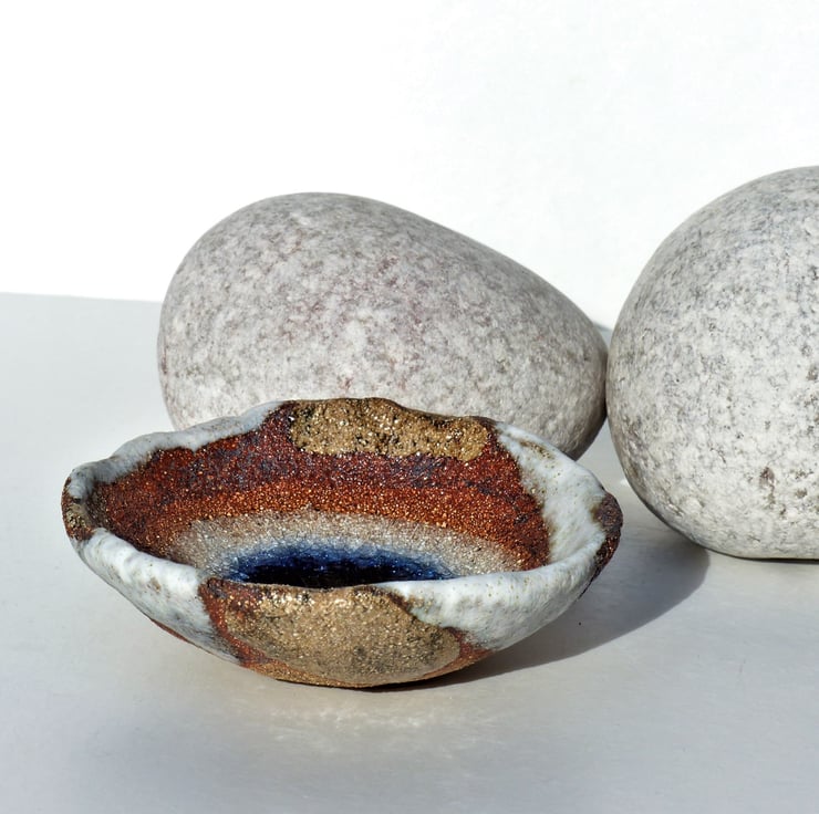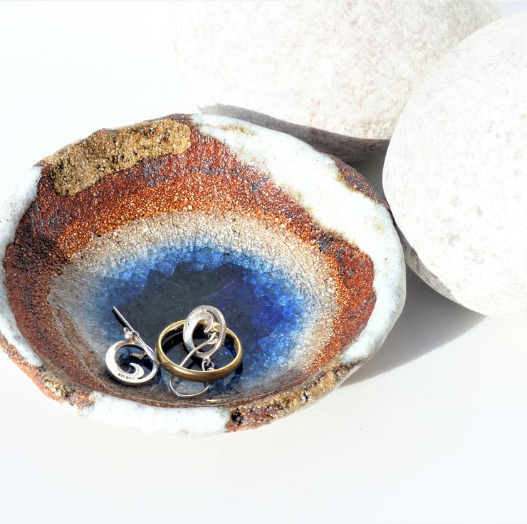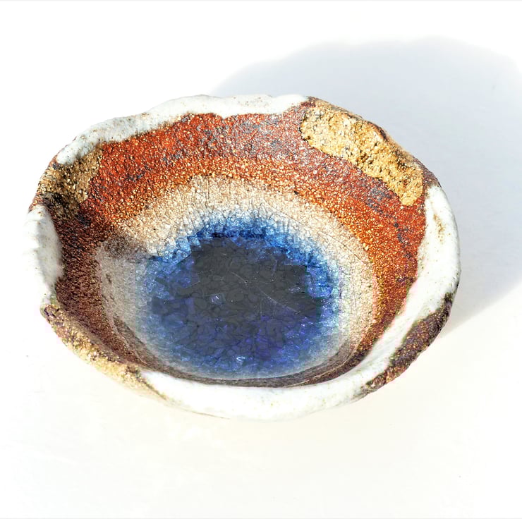 A handmade stoneware ceramic bowl with a beautiful blue pool of melted glass in the centre.