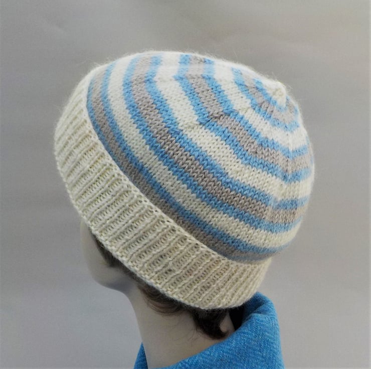 Here' s a pretty beanie for the colder weather. I have hand-knit this women's beanie from a blend of two of the softest British wools: Wensleydale and Blue-faced Leicester. It has a simple stripe design in beige, cream and light blue. The stretchy ribbed welt can be turned up to keep your ears warm or down for a slouchy style. The sweet little "Roses Workshop" brand label is laser etched faux leather.