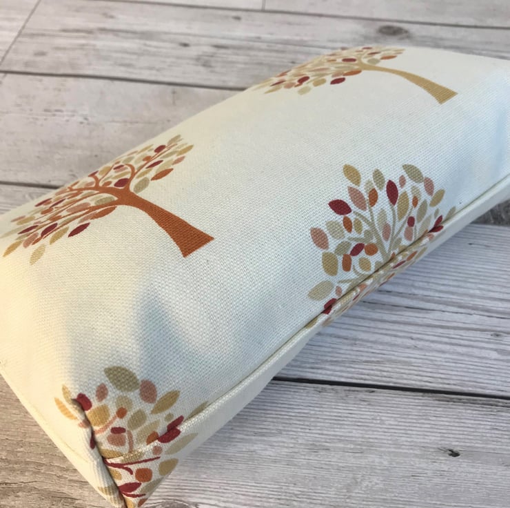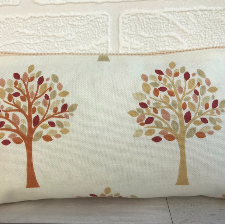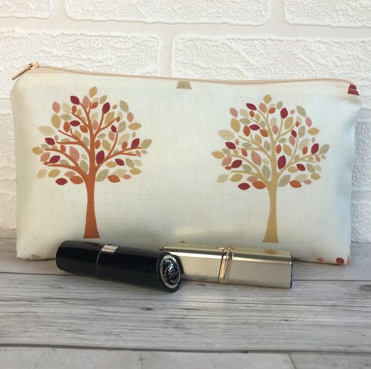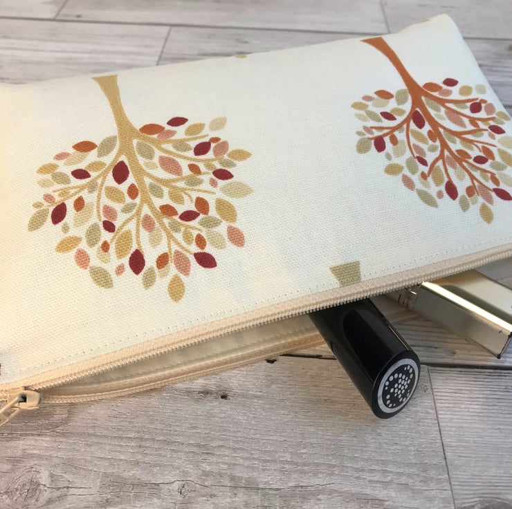 A useful cosmetic bag in cream fabric with a pretty print pattern featuring trees. The colours of the trees are autumnal shades of peach, golden yellow, russet brown and beige. The make up bag has a peachy cream zip and is lined with cream fabric. The base of the bag is boxed to give extra space inside.