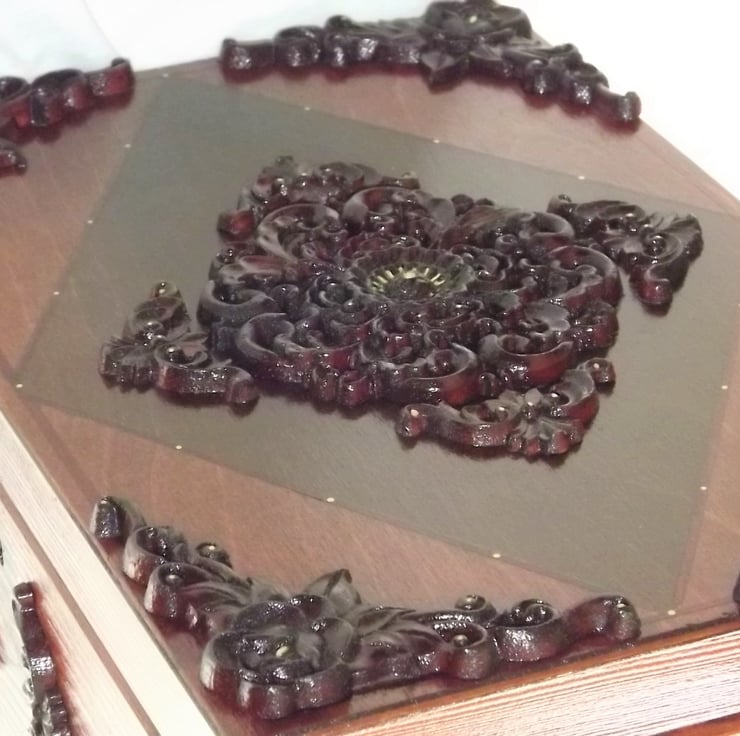 This is a very Beautiful wooden lockable box adorned with carved wooden embellishment and an intricately carved wooden centerpiece.
